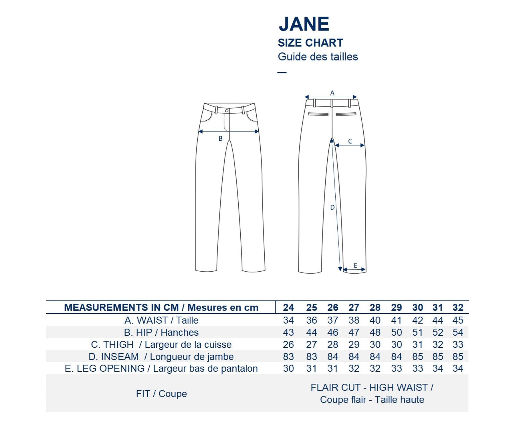 Le jean Jane a une coupe flare, absolument Sixties, ajustée jusqu’au genou et et élargie en-dessous, c’est un indispensable dans une garde robe avec son look très marqué.