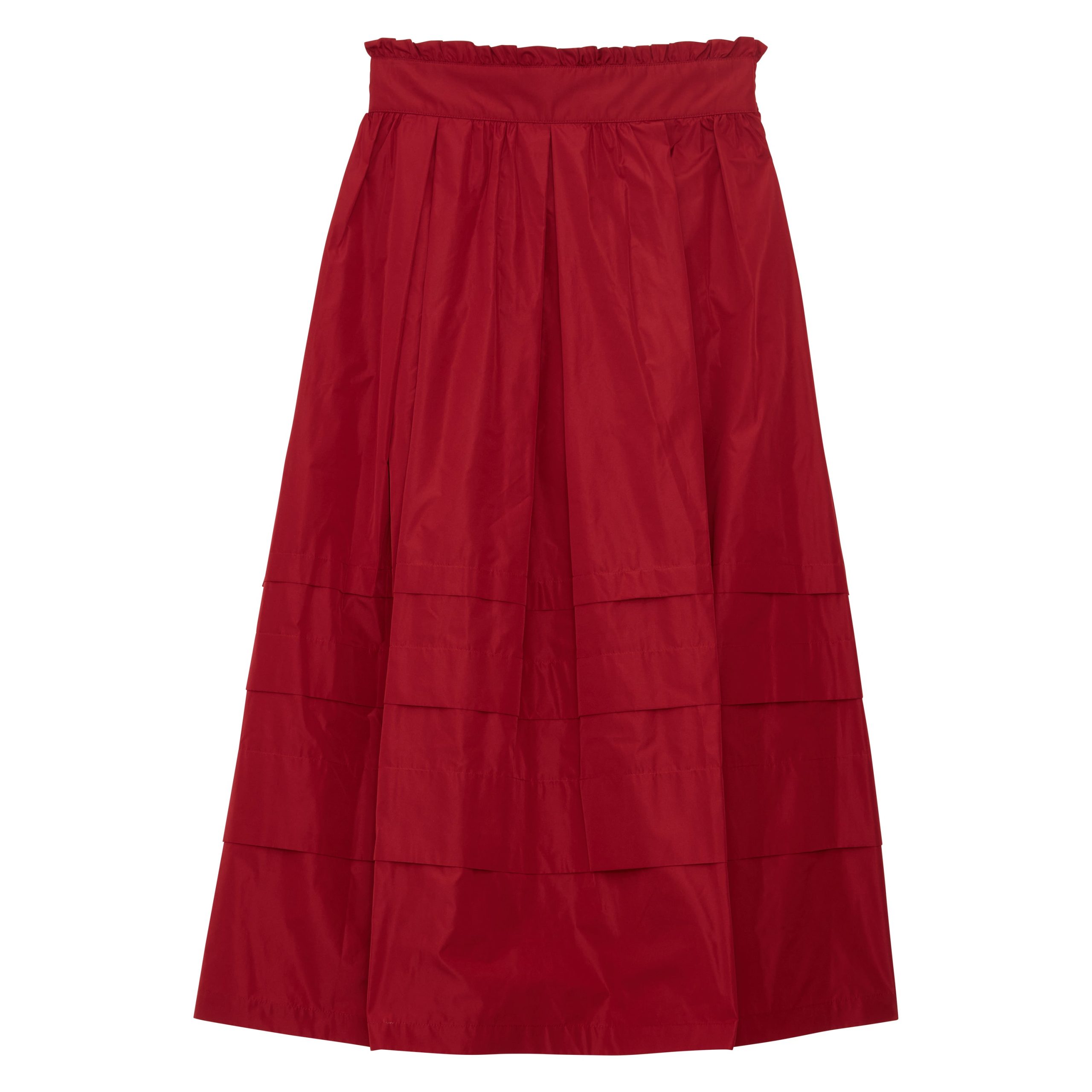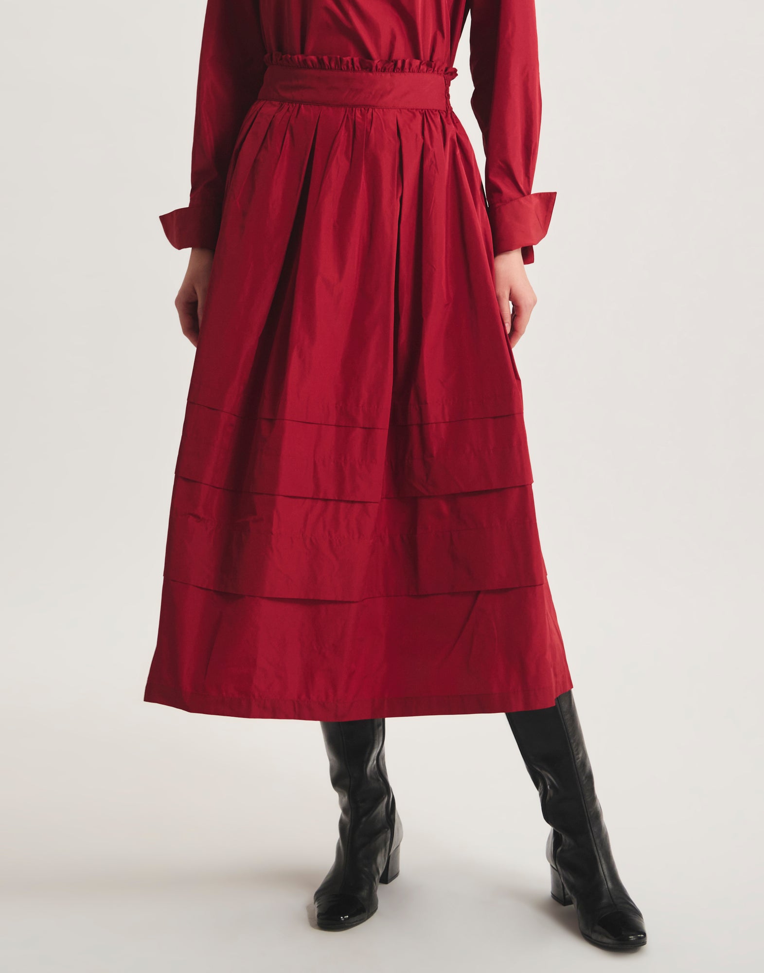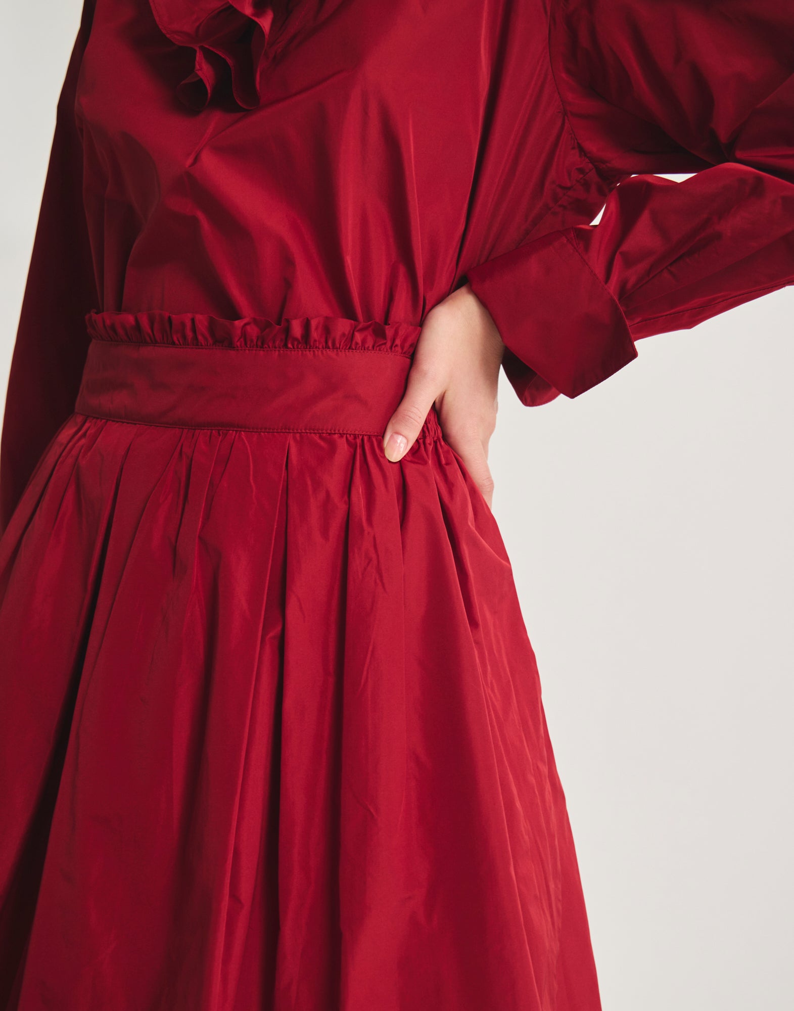Alliance parfaite entre simplicité et raffinement, la jupe Héloïse en taffetas rouge séduit par son allure élégante. Sa coupe évasée ponctuée de volants apporte un joli volume en mouvement, tandis que la taille élastiquée et les plis subtils soulignent une silhouette fluide sans effort. Une pièce versatile qui traverse les saisons avec élégance.