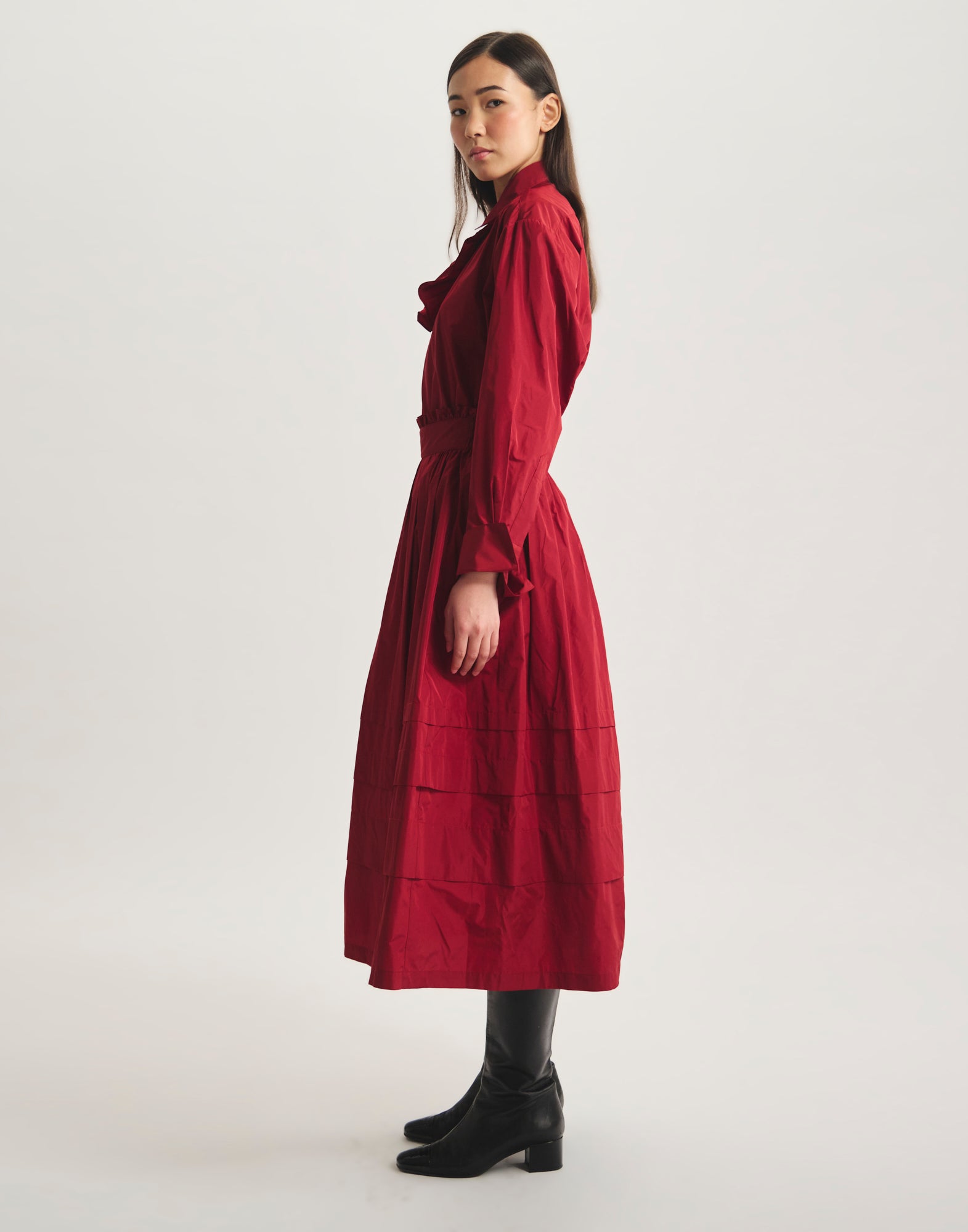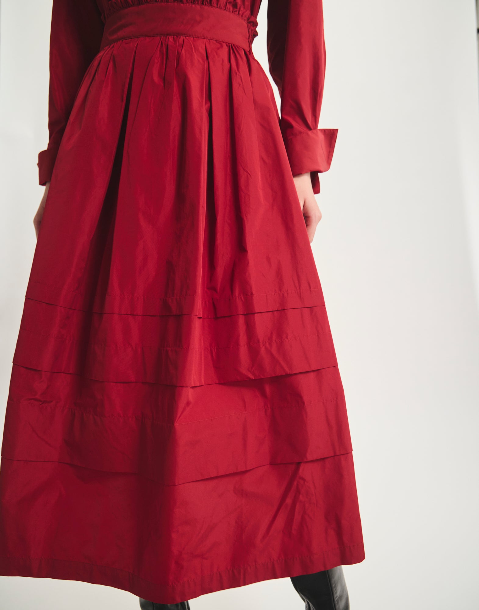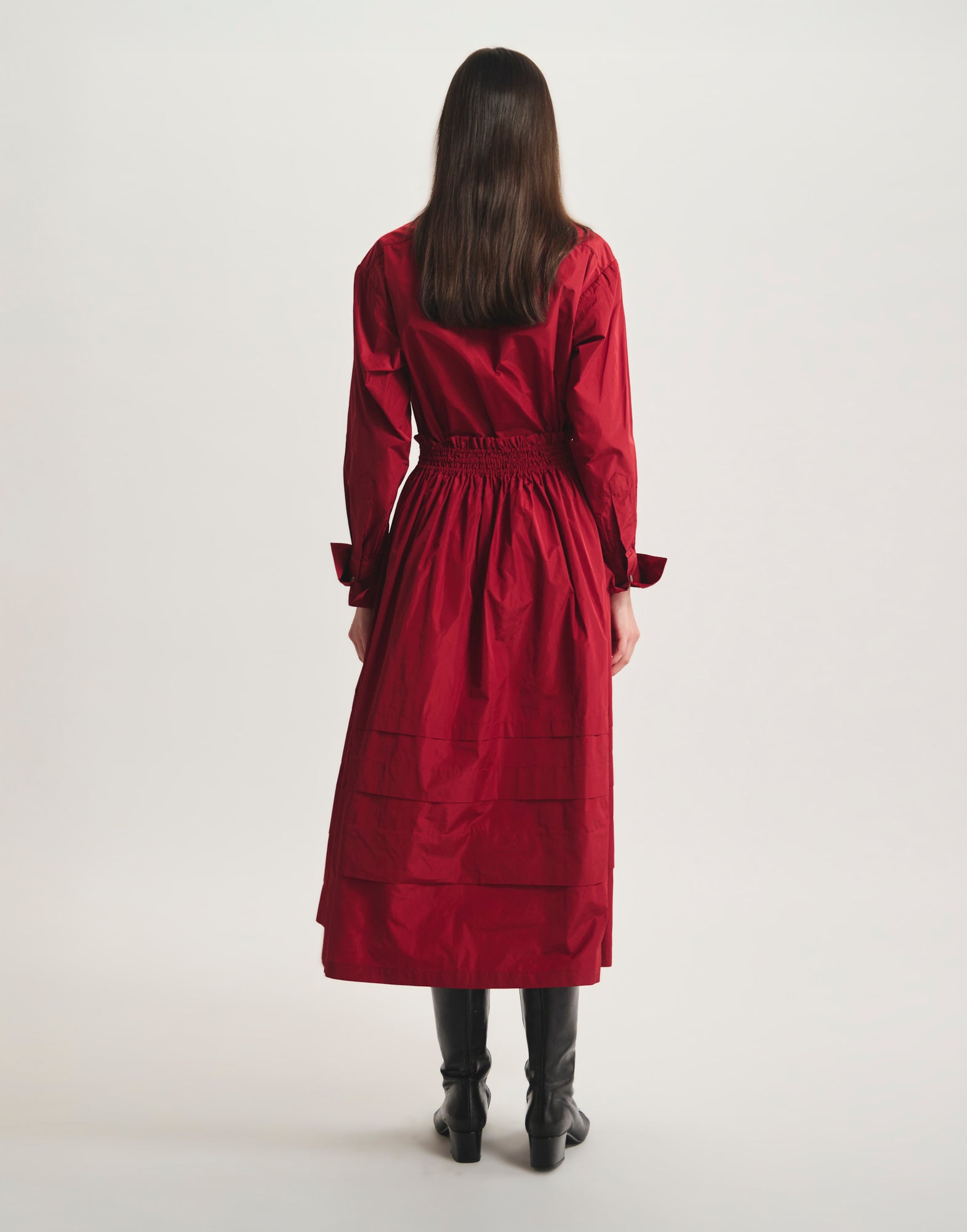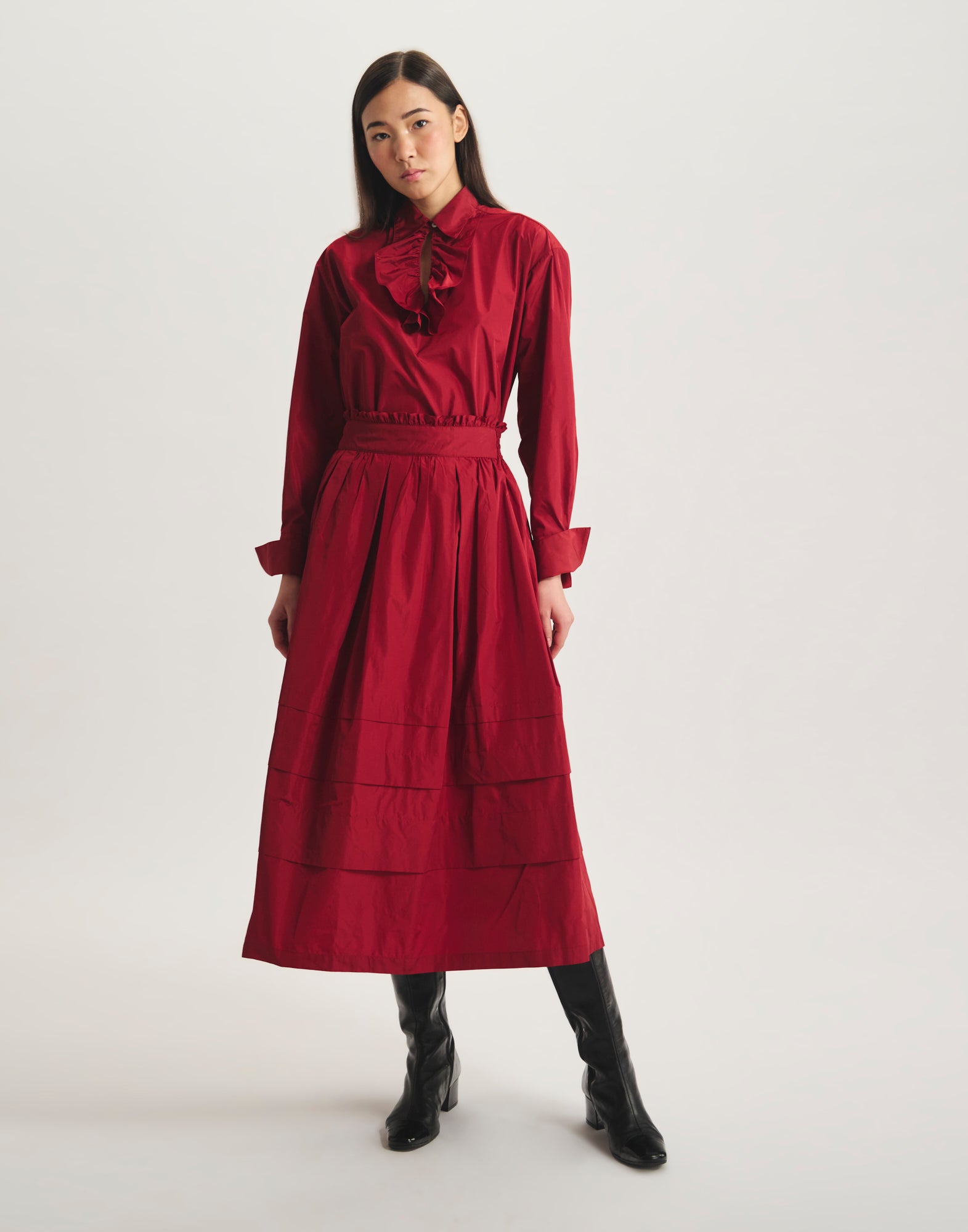 Alliance parfaite entre simplicité et raffinement, la jupe Héloïse en taffetas rouge séduit par son allure élégante. Sa coupe évasée ponctuée de volants apporte un joli volume en mouvement, tandis que la taille élastiquée et les plis subtils soulignent une silhouette fluide sans effort. Une pièce versatile qui traverse les saisons avec élégance.