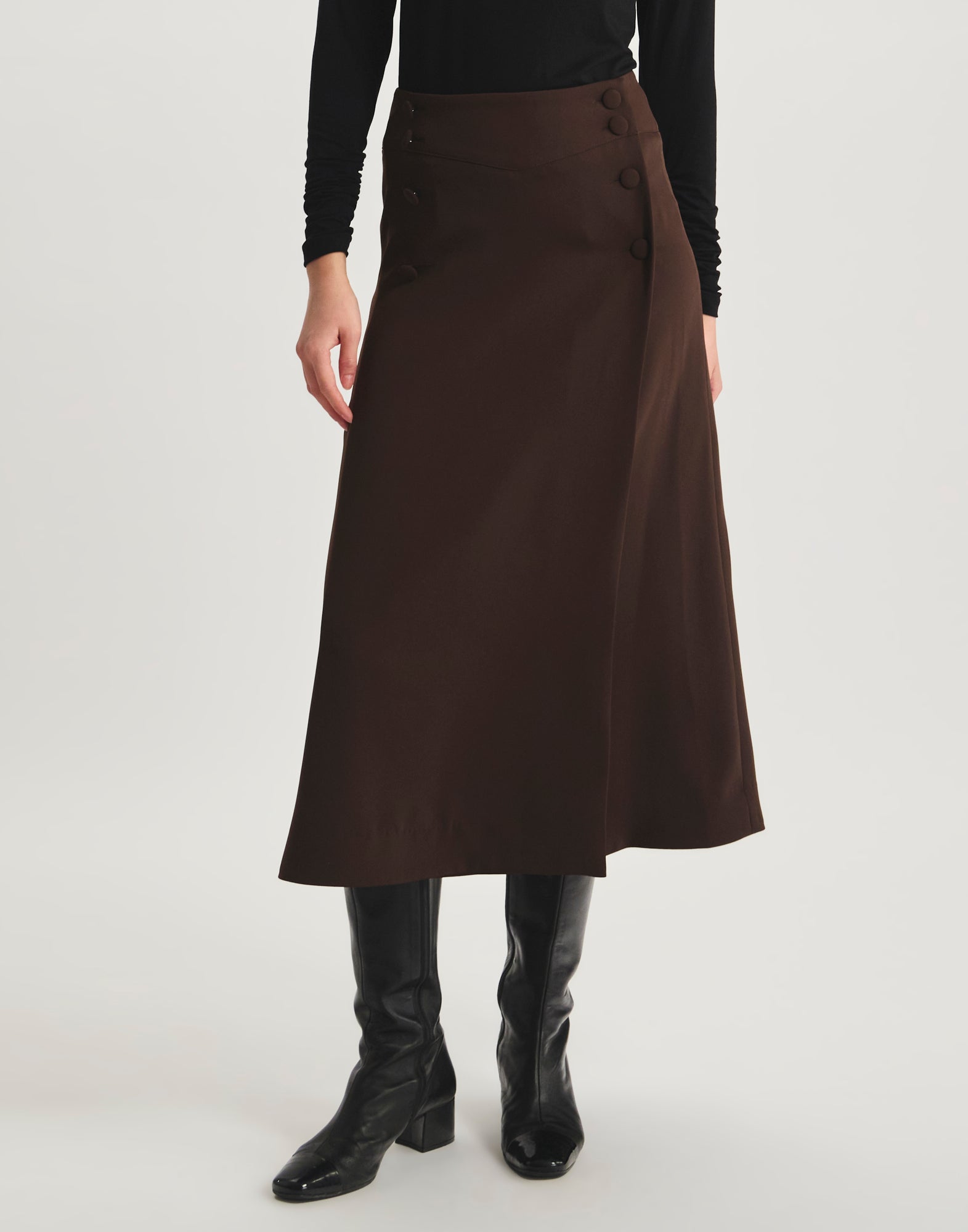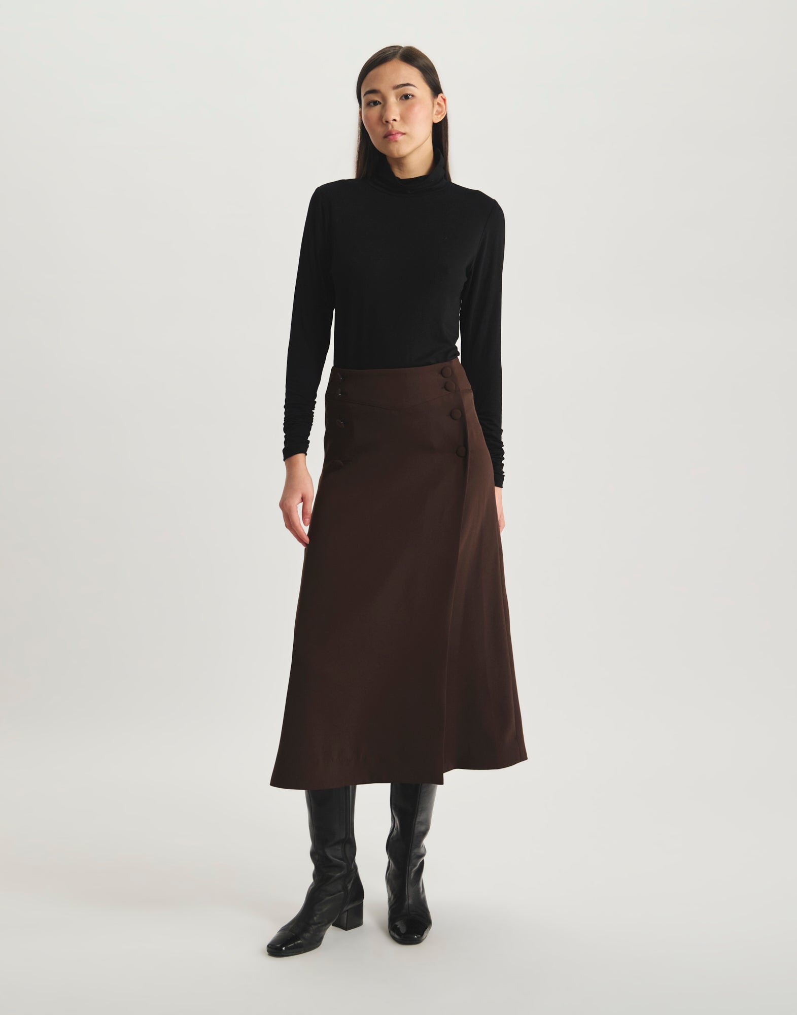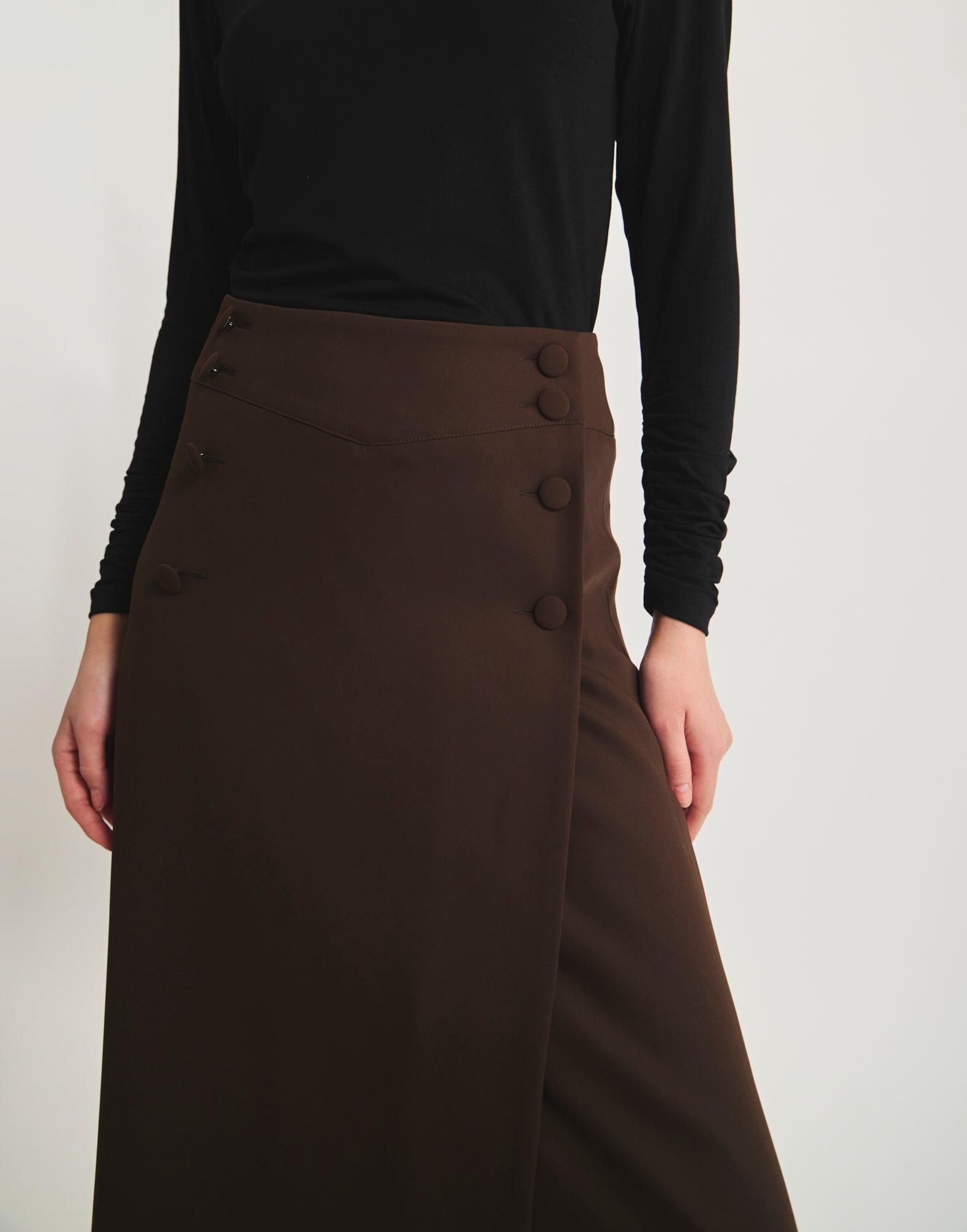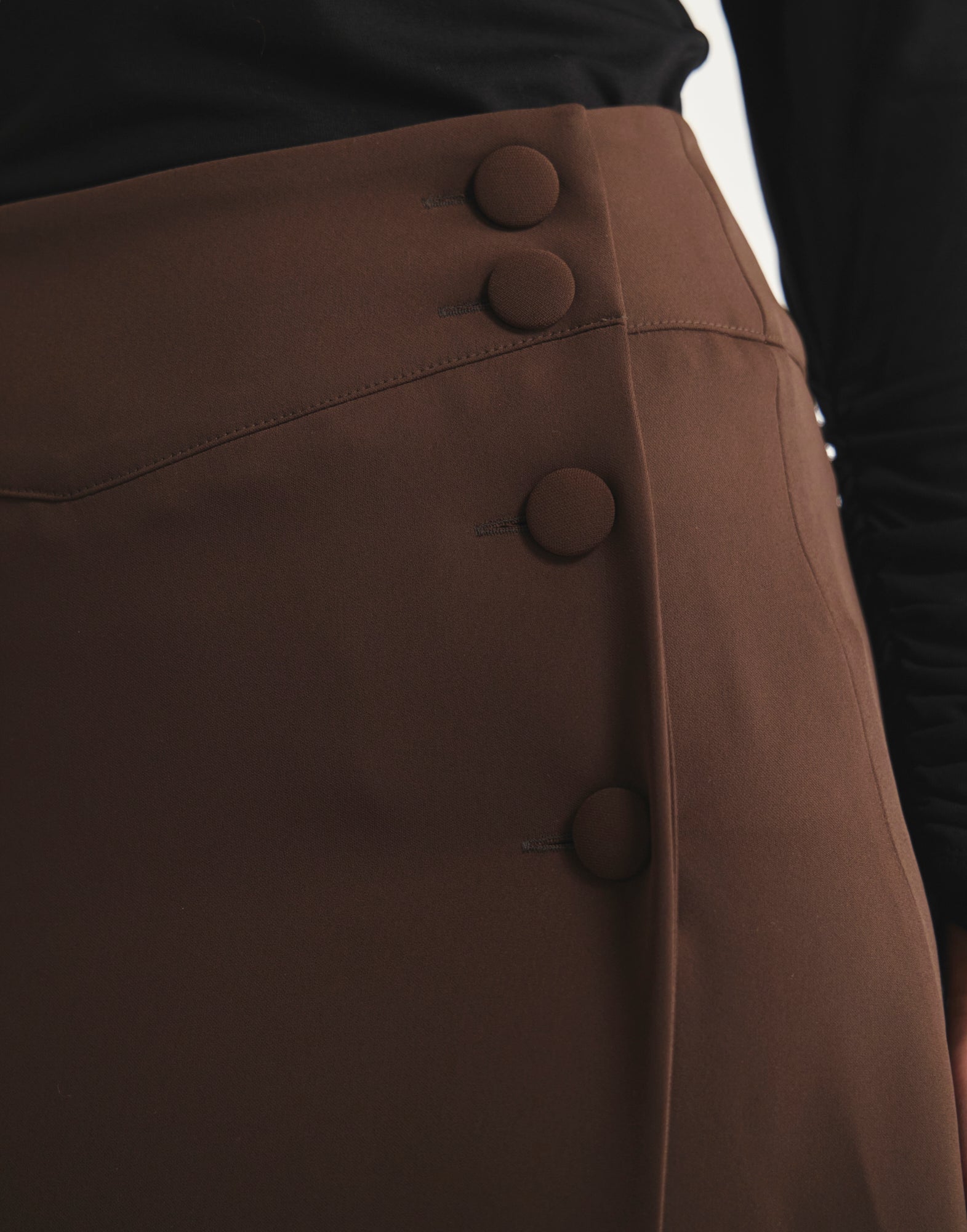 Déclinée en brun profond, la jupe Tales affirme un style sobre et sophistiqué. Sa texture fluide et légèrement satinée capte la lumière avec élégance, tandis que la coupe portefeuille souligne naturellement la taille. Chic sans effort, elle accompagne aussi bien un look structuré qu’une allure plus décontractée. Un essentiel polyvalent, à l’élégance parisienne.