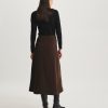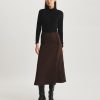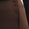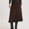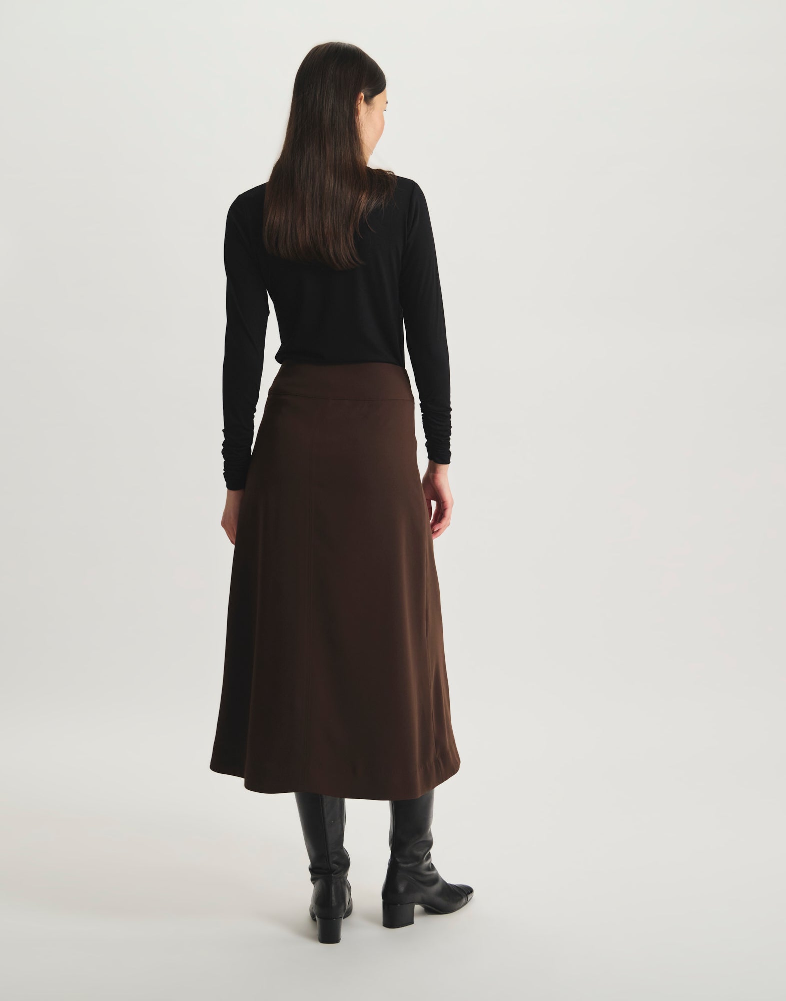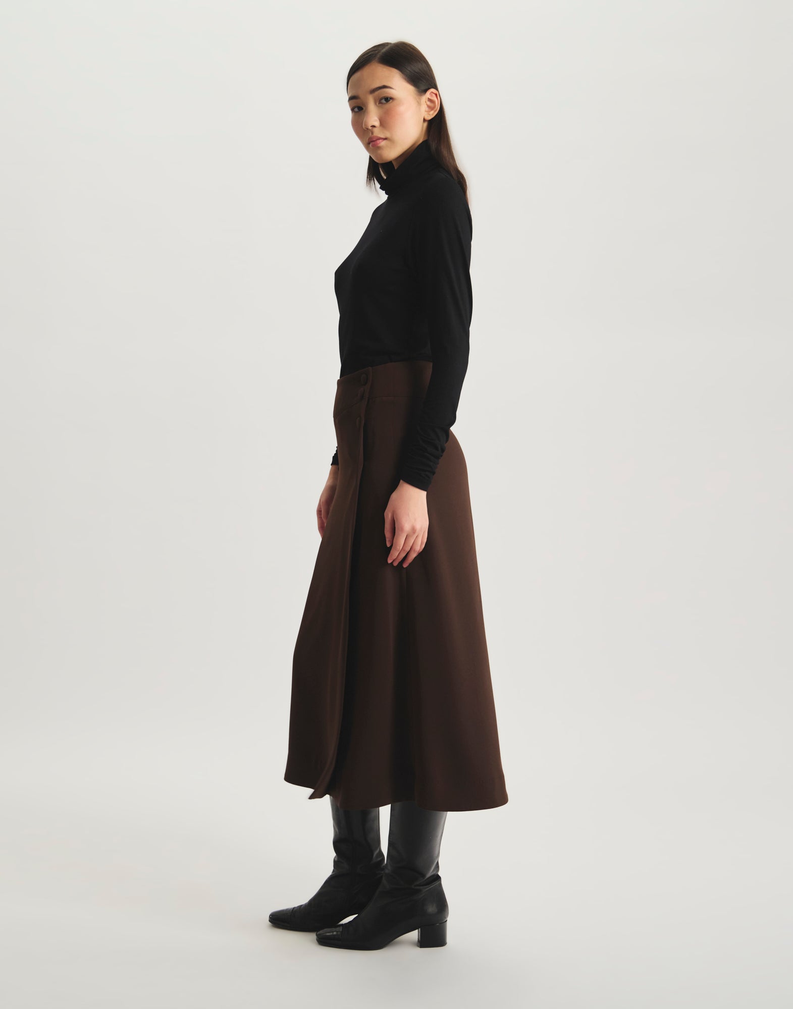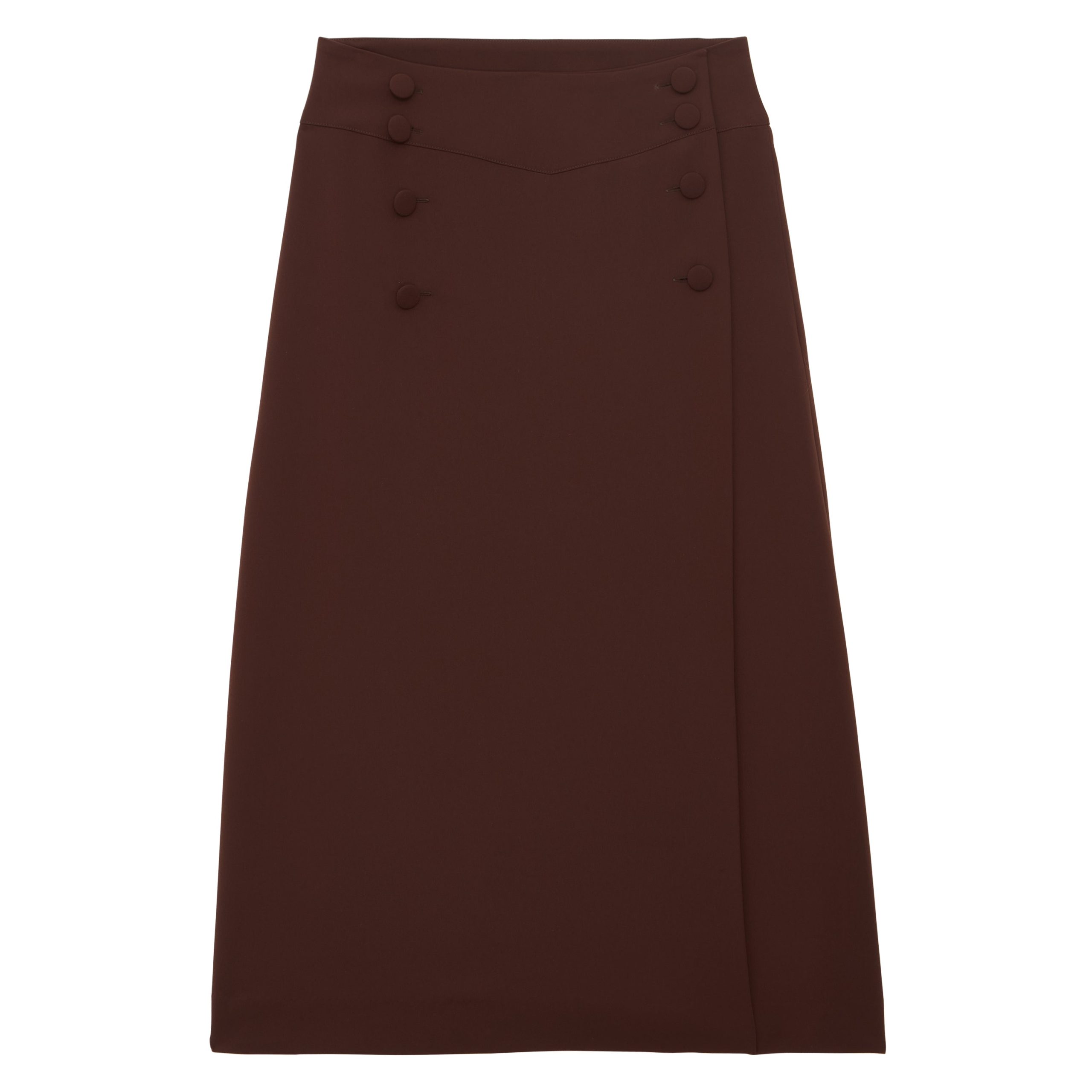 Déclinée en brun profond, la jupe Tales affirme un style sobre et sophistiqué. Sa texture fluide et légèrement satinée capte la lumière avec élégance, tandis que la coupe portefeuille souligne naturellement la taille. Chic sans effort, elle accompagne aussi bien un look structuré qu’une allure plus décontractée. Un essentiel polyvalent, à l’élégance parisienne.