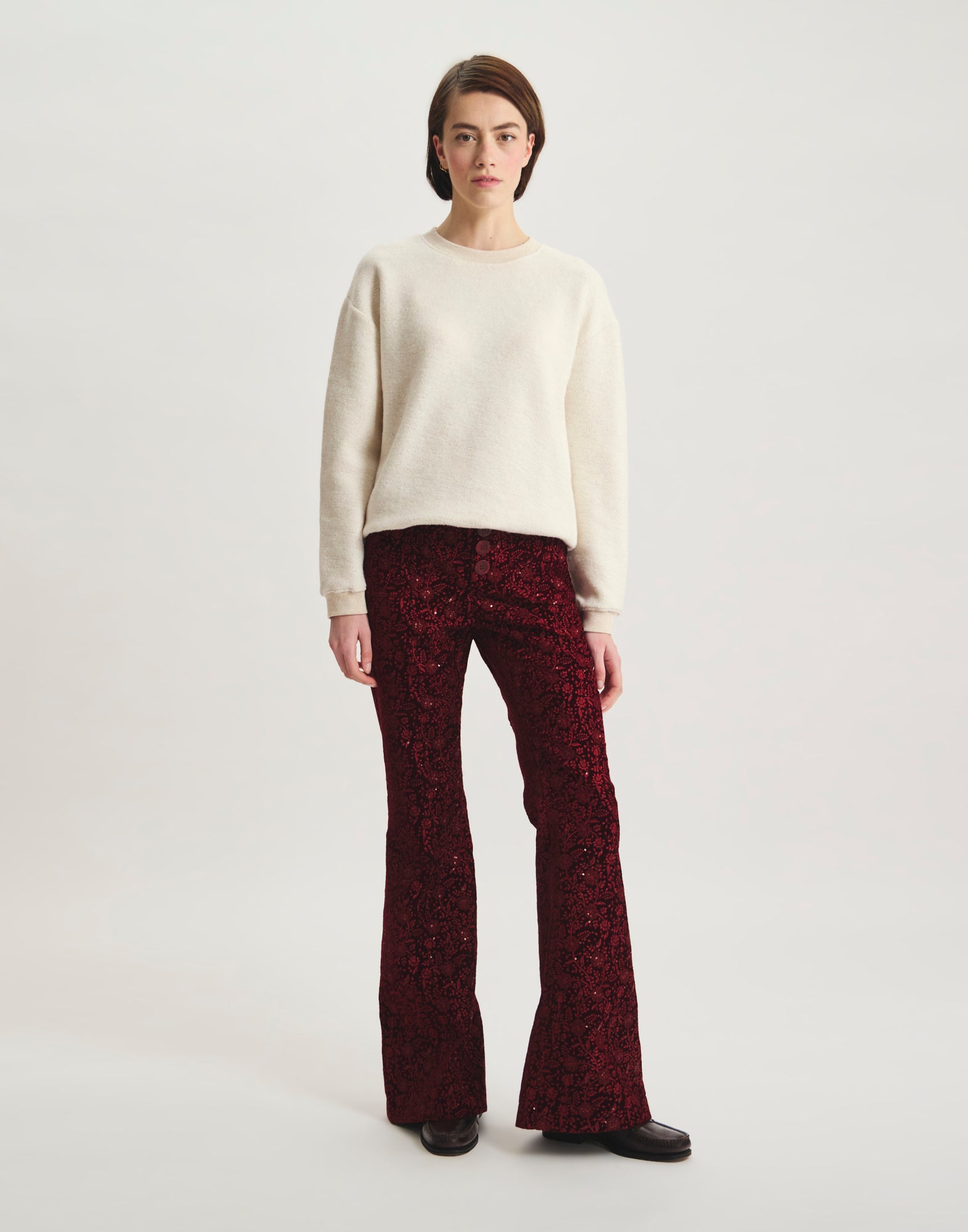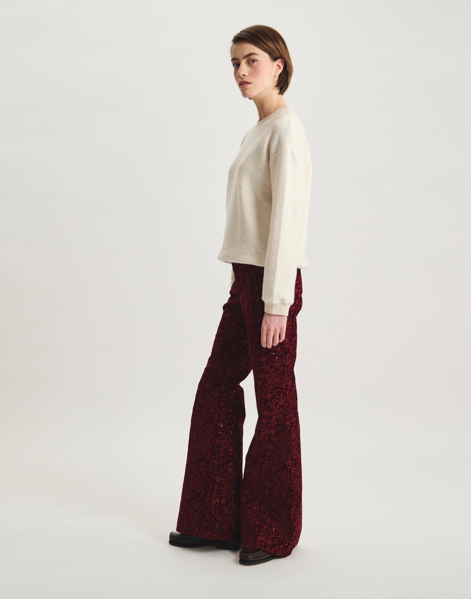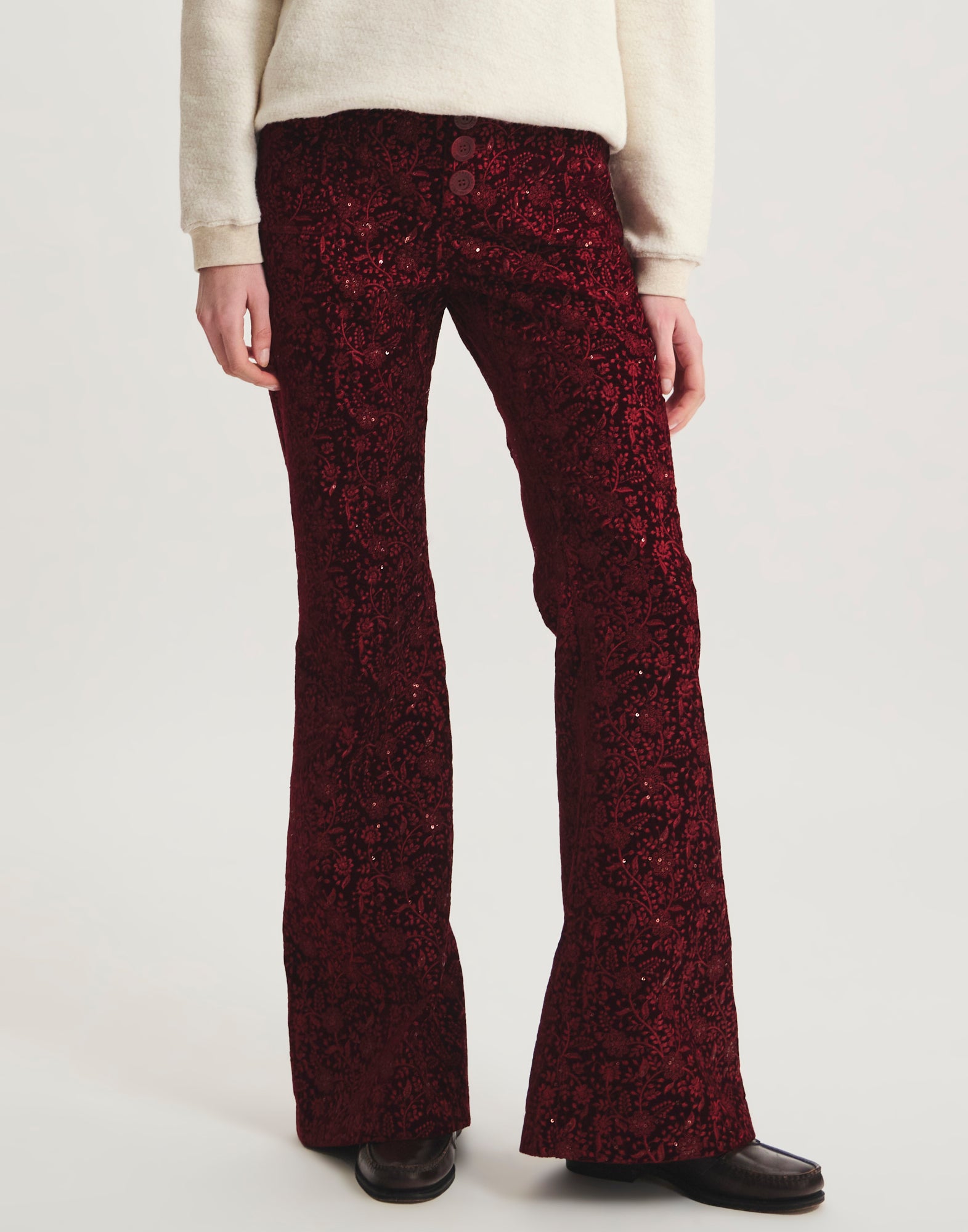 Proposé dans un profond Rouge Bordeaux et rehaussé de broderies discrètes et raffinées, le pantalon Charlotte gagne en sophistication. Sa coupe flare iconique allonge la jambe avec grâce, tandis que les finitions soignées et les poches boutonnées ajoutent du caractère. Un modèle qui conjugue élégance classique et détails précieux, parfait pour une silhouette affirmée, de jour comme de soir.