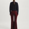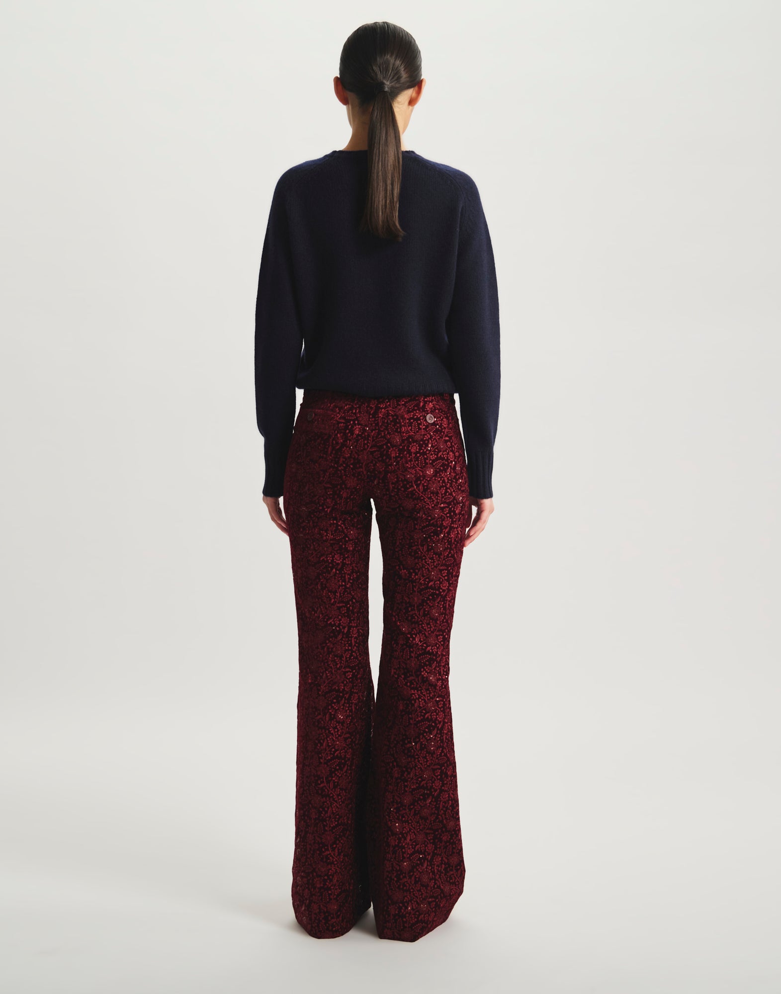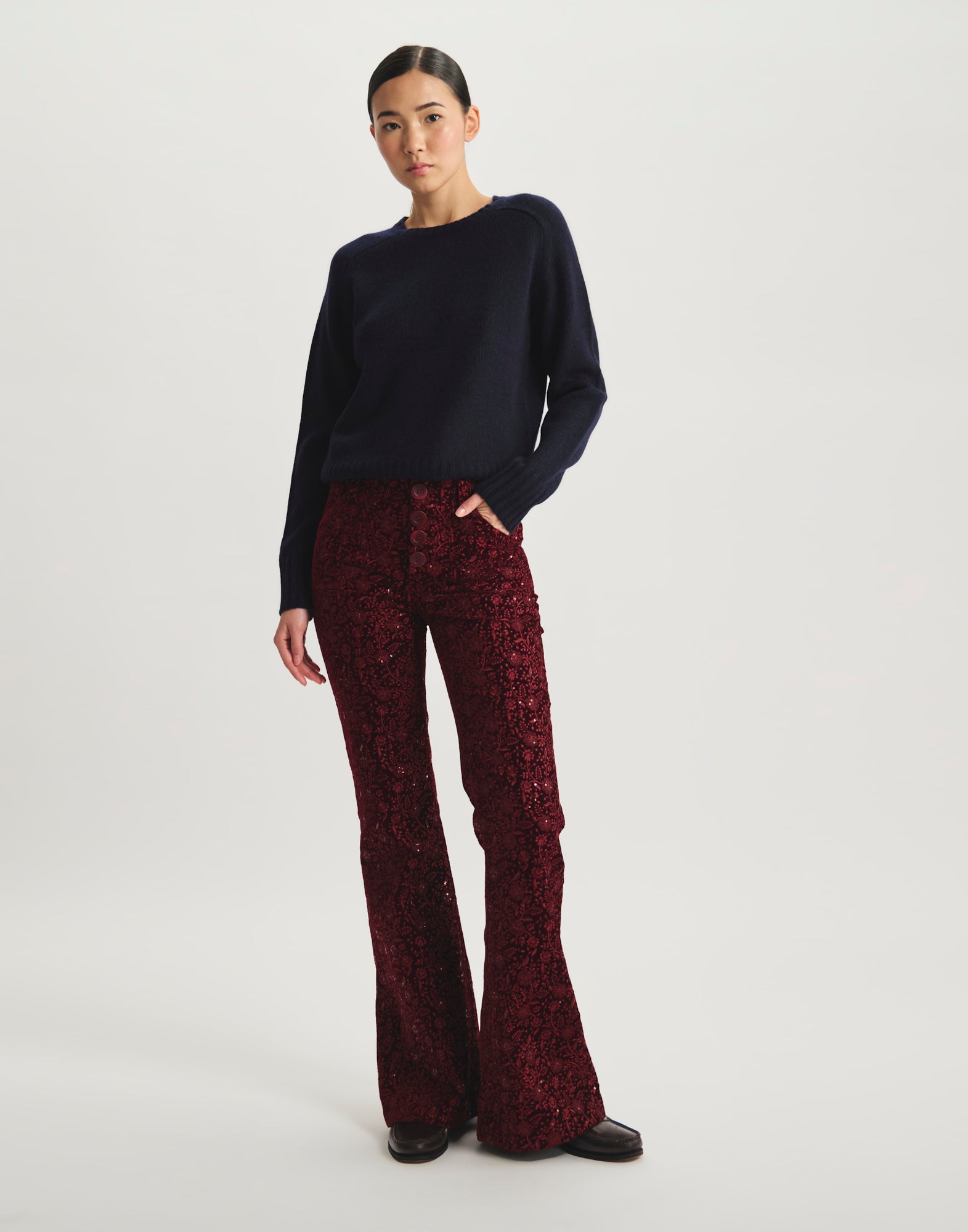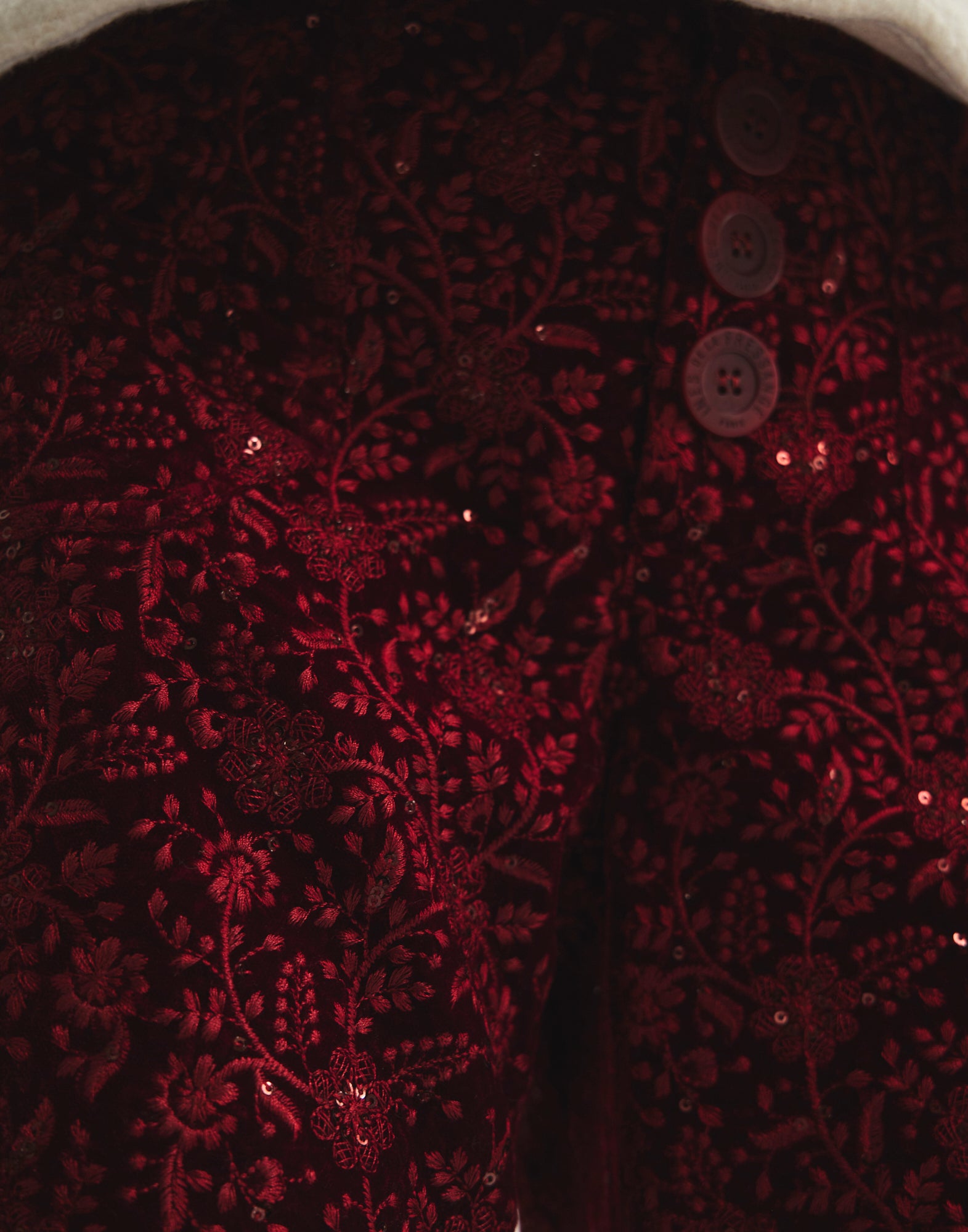 Proposé dans un profond Rouge Bordeaux et rehaussé de broderies discrètes et raffinées, le pantalon Charlotte gagne en sophistication. Sa coupe flare iconique allonge la jambe avec grâce, tandis que les finitions soignées et les poches boutonnées ajoutent du caractère. Un modèle qui conjugue élégance classique et détails précieux, parfait pour une silhouette affirmée, de jour comme de soir.