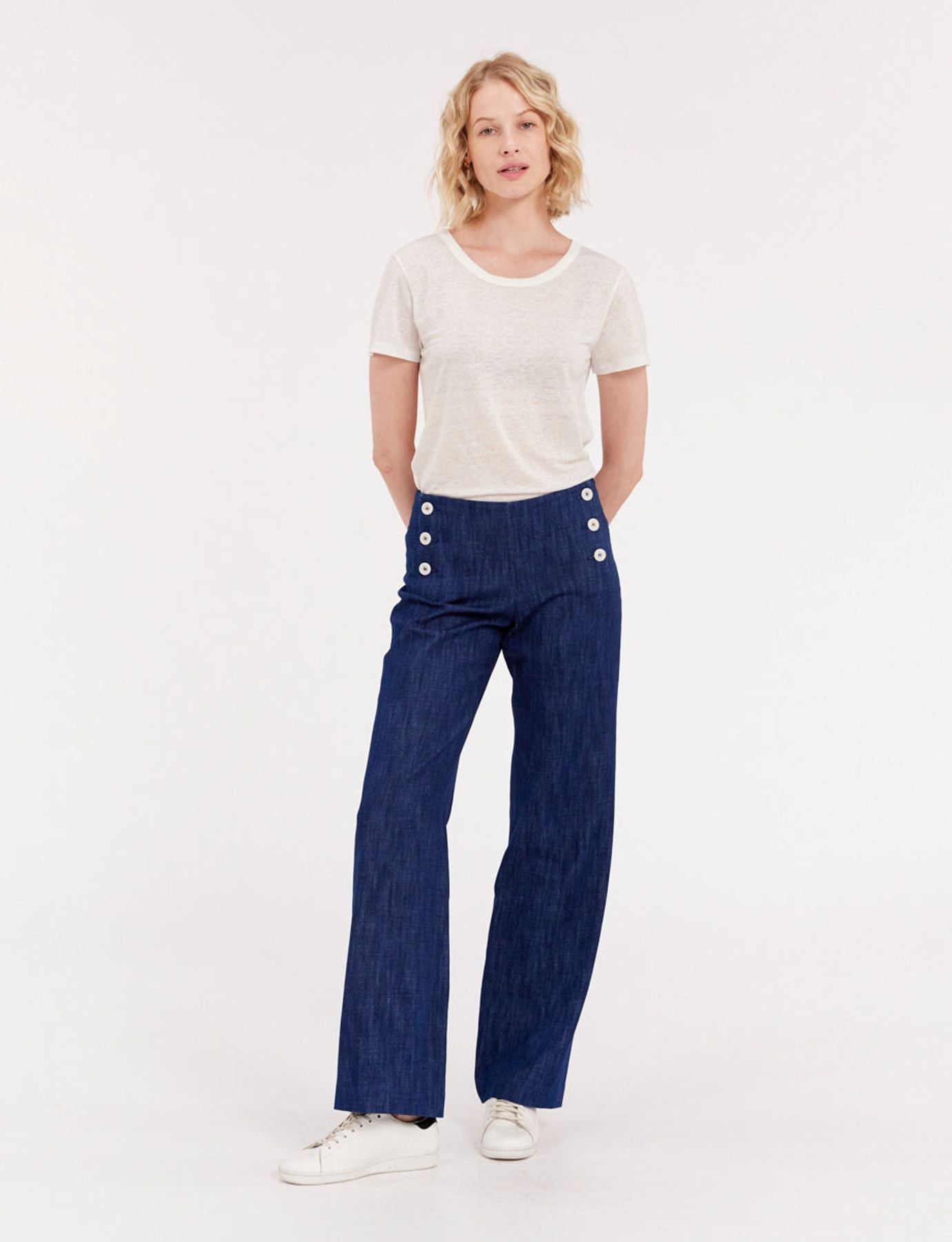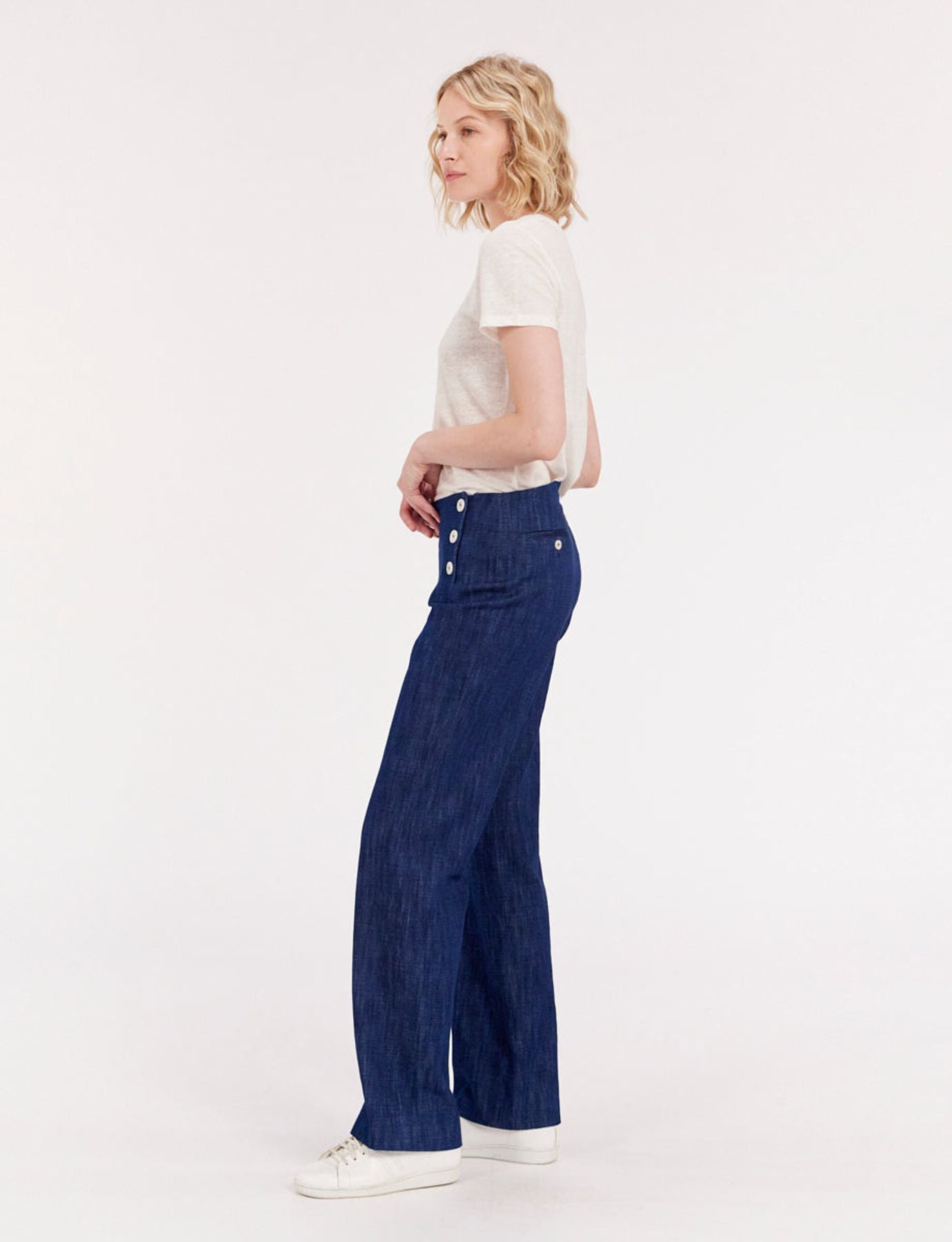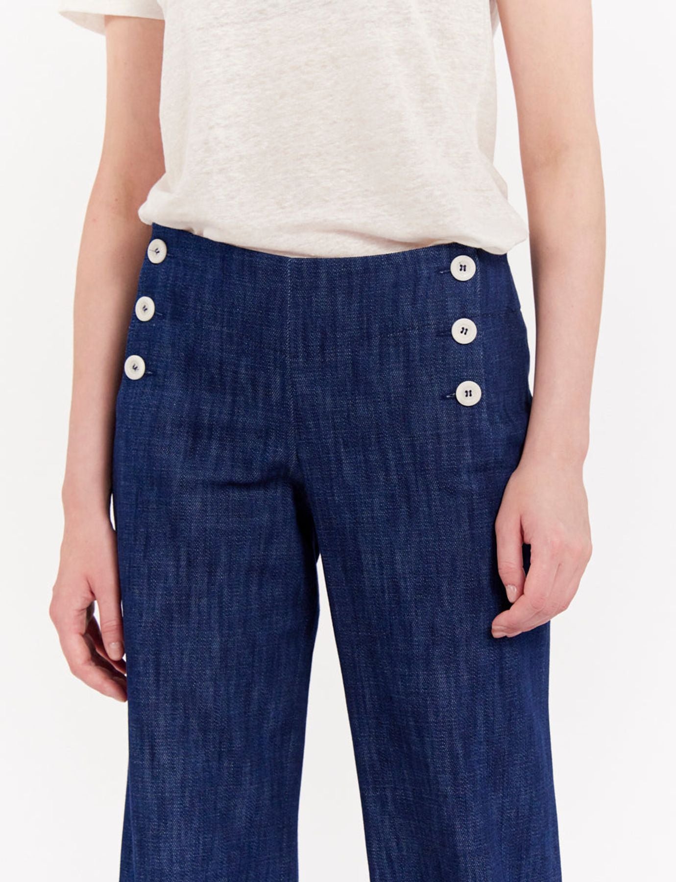 Le pantalon Gabriel est aussi élégant que confortable, ce modèle est appelé « à pont » du fait de sa taille haute rehaussée par une double rangée de boutons. Avec sa coupe droite, il est plus que jamais un pantalon adoré des femmes du monde entier, un indémodable ! Il est ici proposé dans un mélange équilibré de lin et coton qui le rend particulièrement remarquable et agréable au porté.