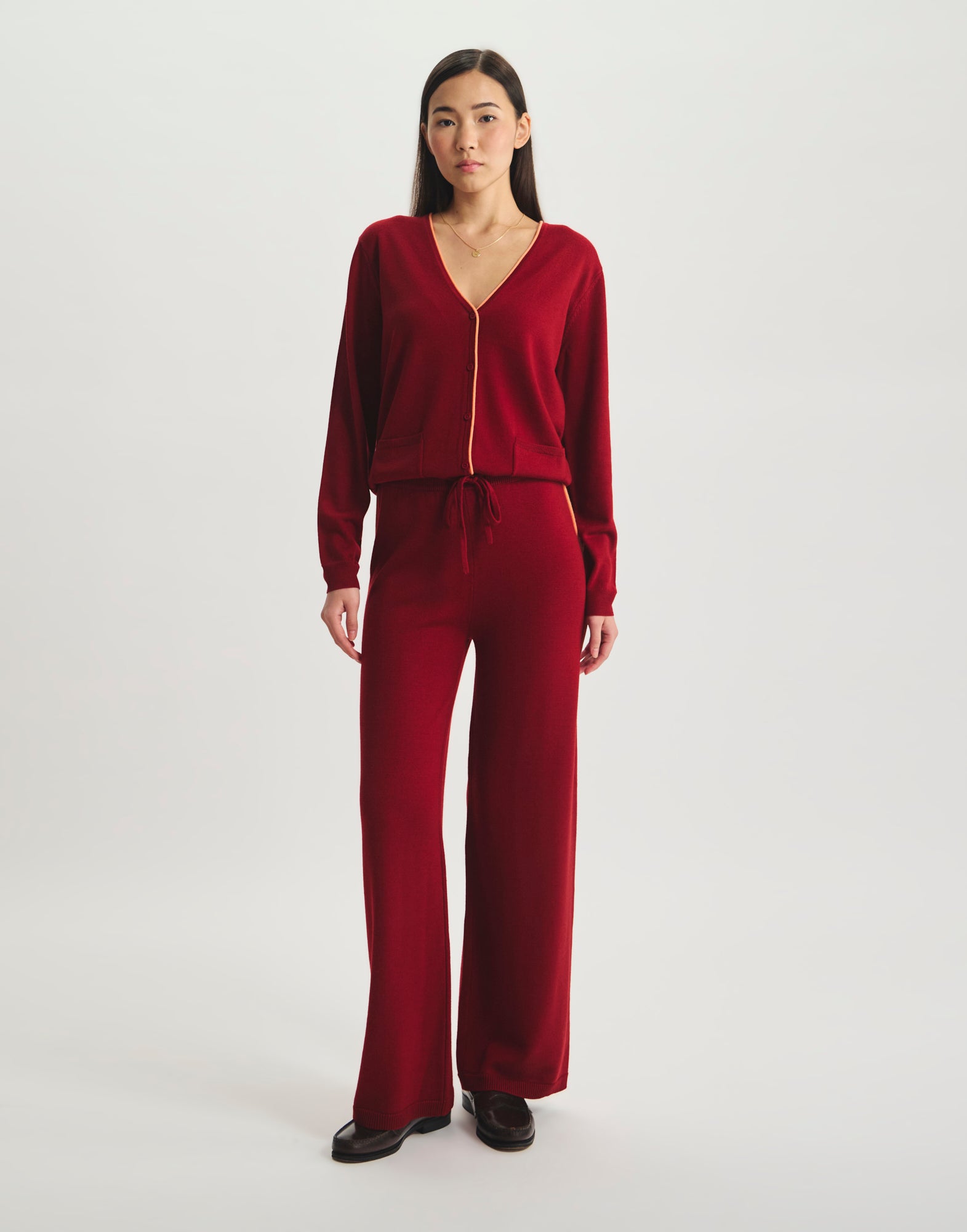 Le pantalon John en maille de laine 100% mérinos, ici dans une vibrante couleur corail, allie confort et style avec sa coupe droite facile à porter. La ceinture en bord-côte contrastée apporte une touche sportive et moderne, tandis que l’élastique et la coulisse garantissent un ajustement parfait sur la taille. Une pièce élégante et décontractée, idéale pour une allure parisienne sans effort.