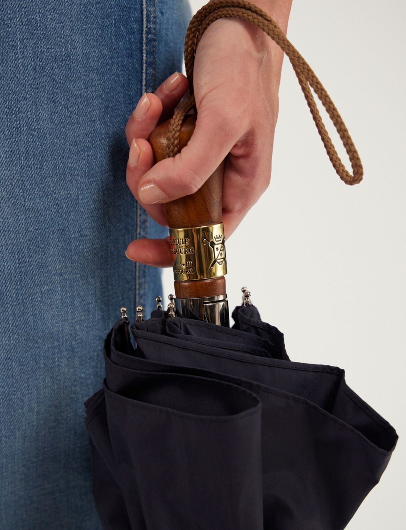 La poignée en bois reprend l’écusson signature du Parapluie de Cherbourg, visible sur la bague de la poignée. Fabrication France