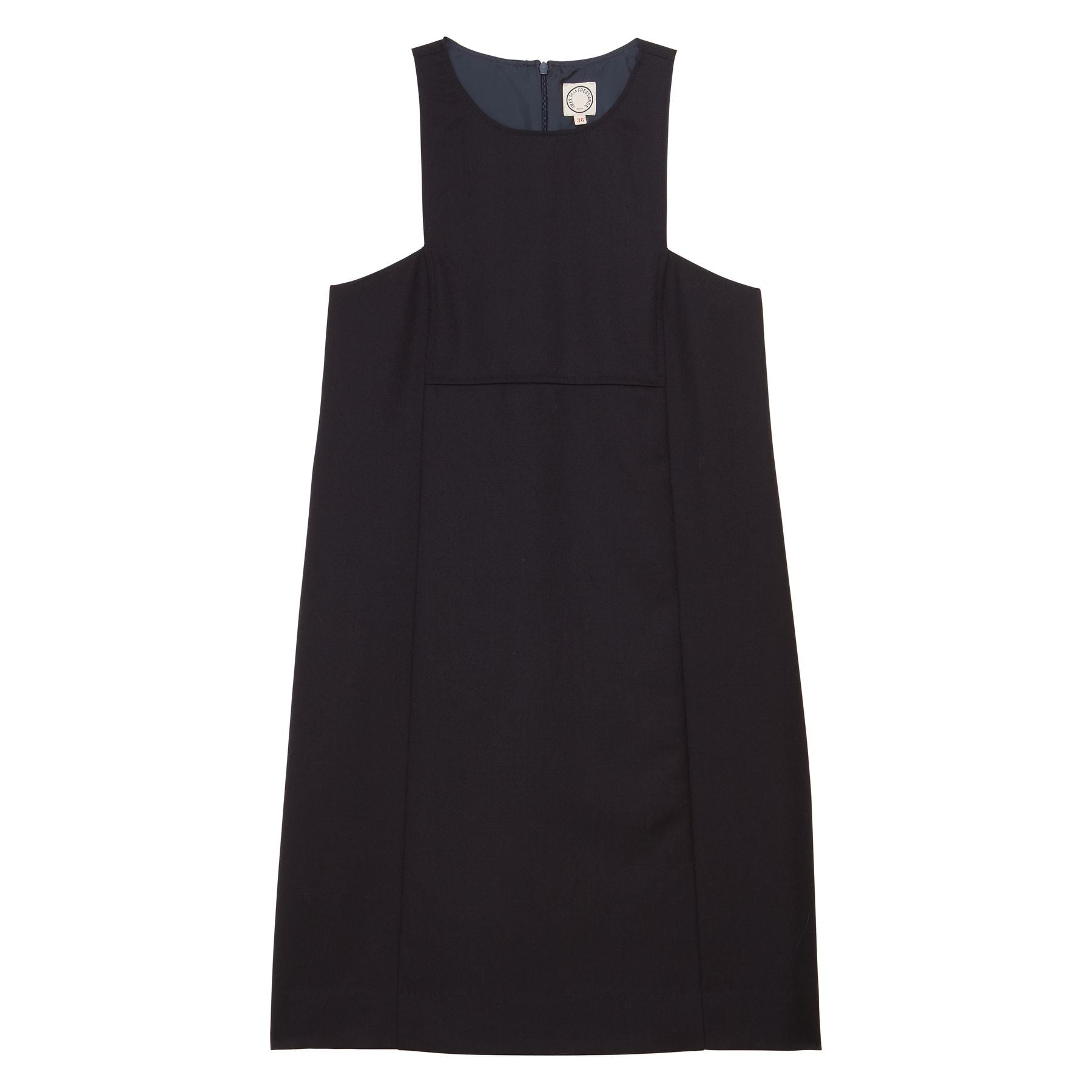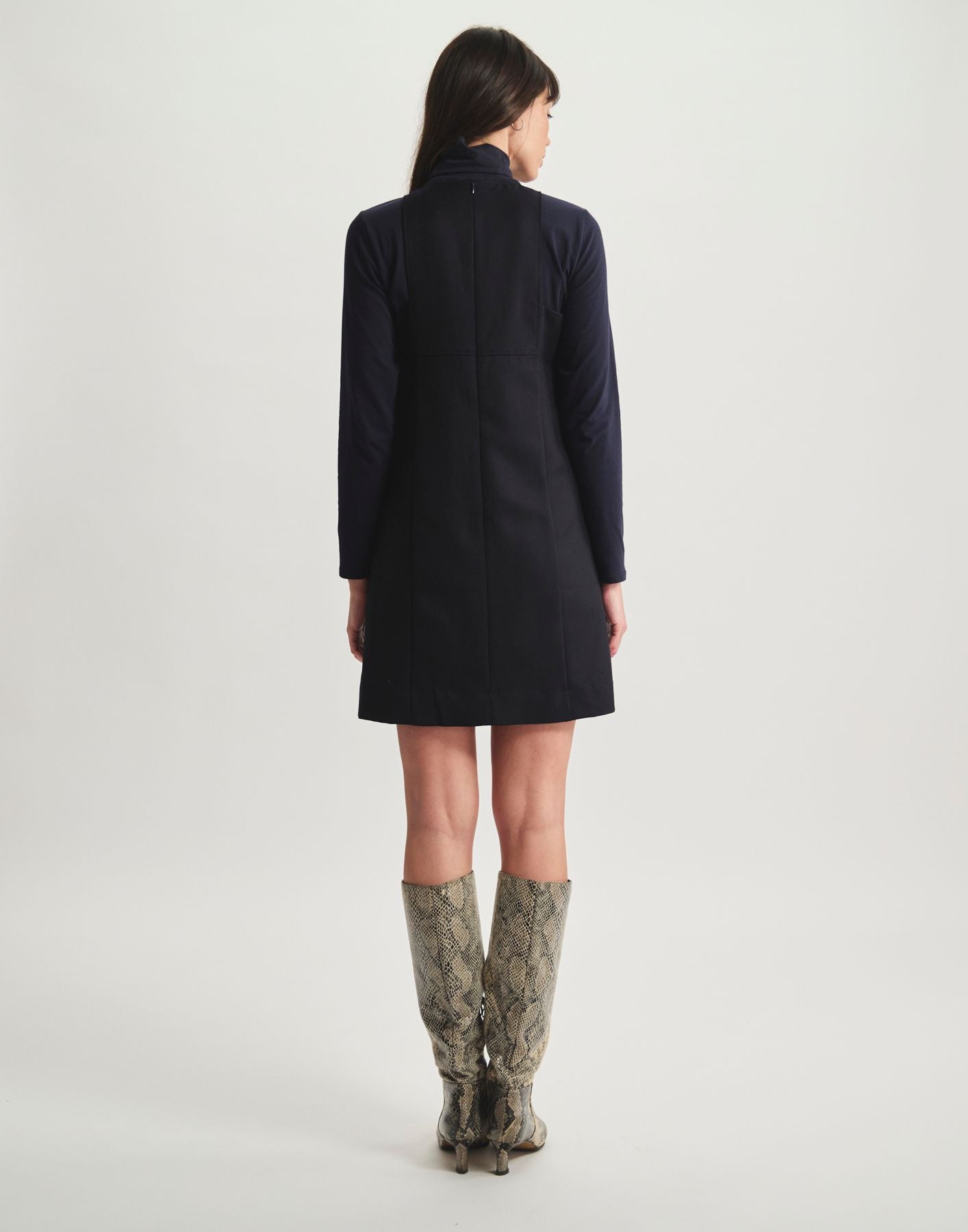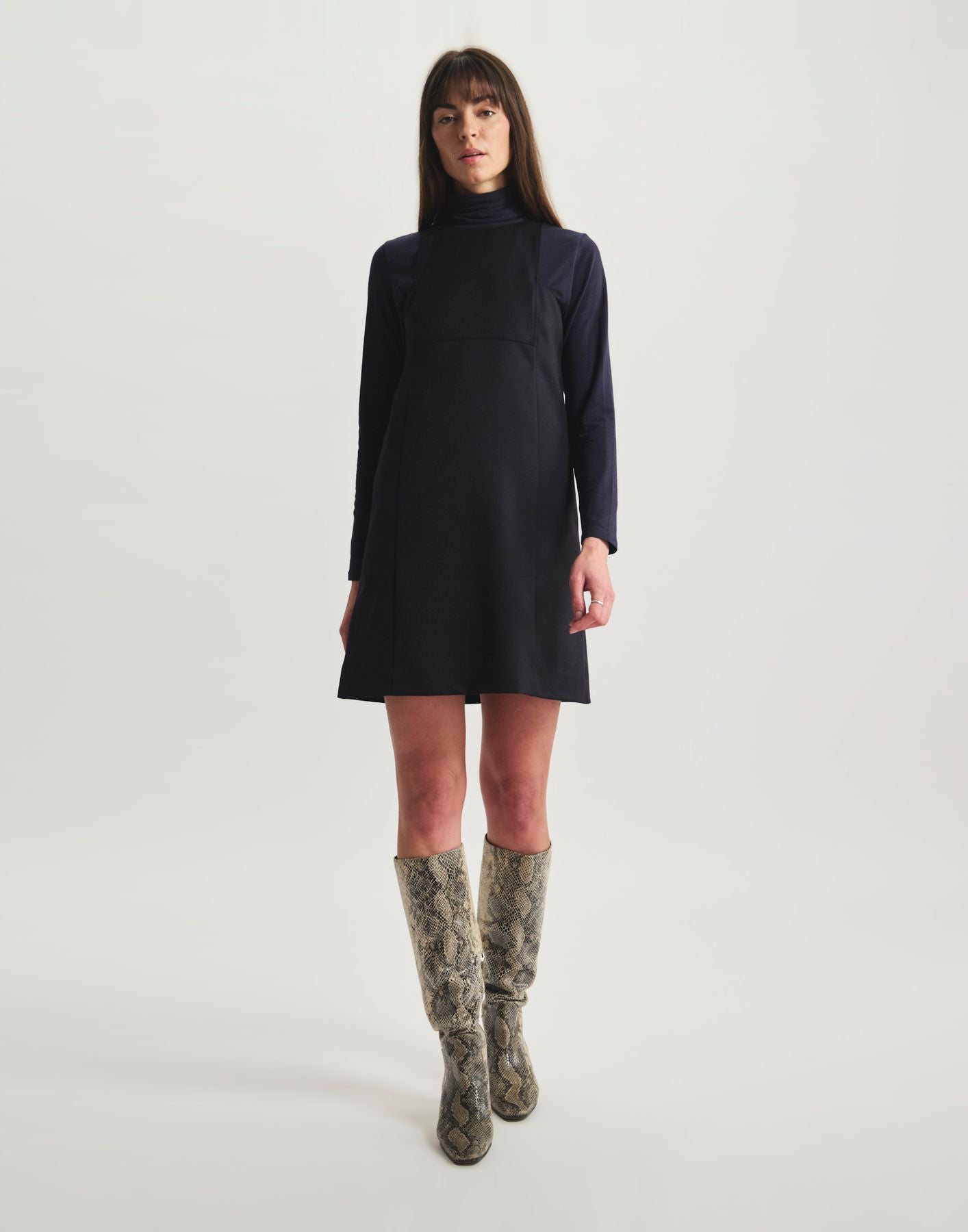 Confectionnée dans une laine douce et chaude, la robe Polly en bleu profond dévoile une silhouette trapèze courte et aérienne, idéale pour allier confort et style. Son col rond épuré et son absence de manches apportent une touche minimaliste, tandis que les empiècements subtils à l’avant et au dos ajoutent du relief à cette pièce intemporelle.r