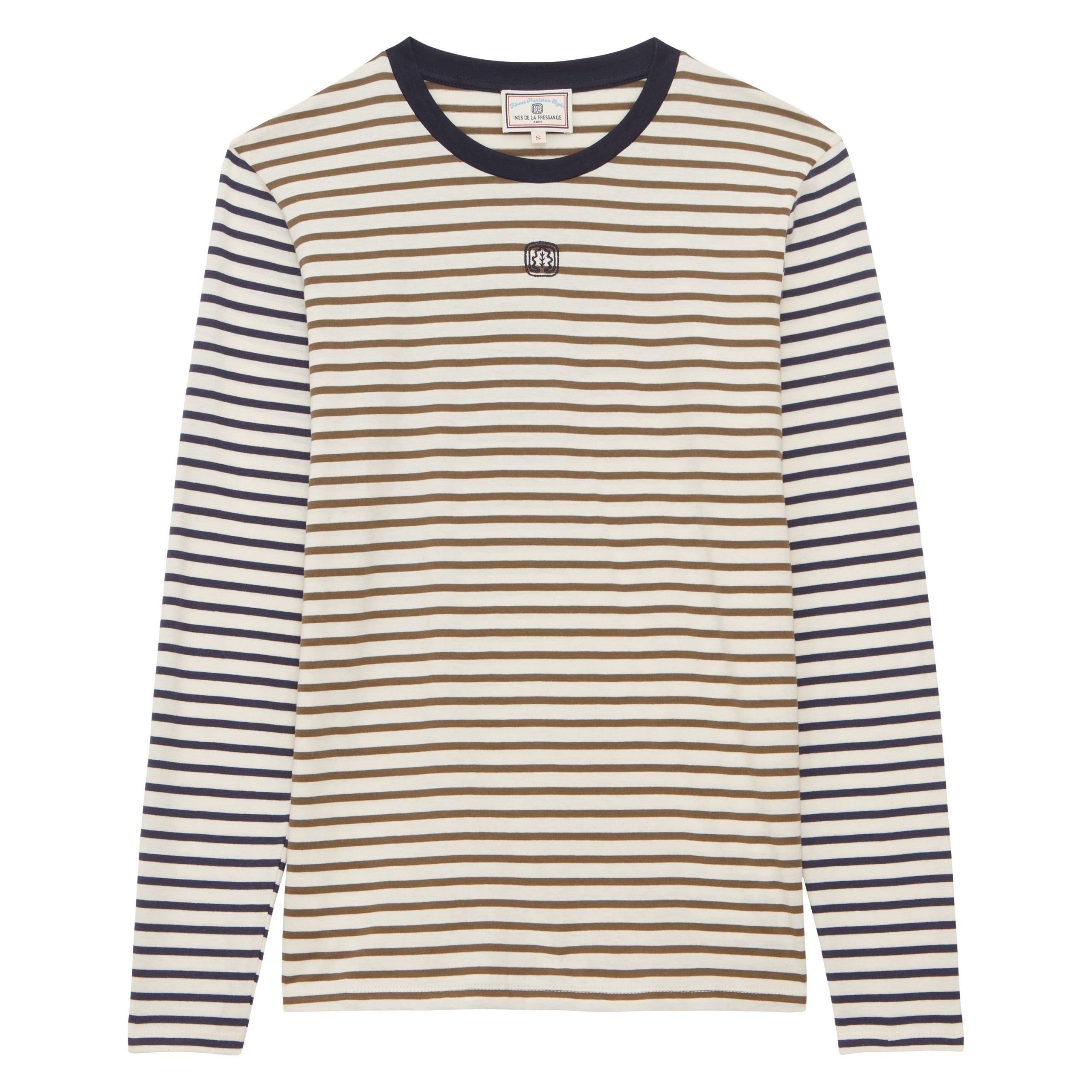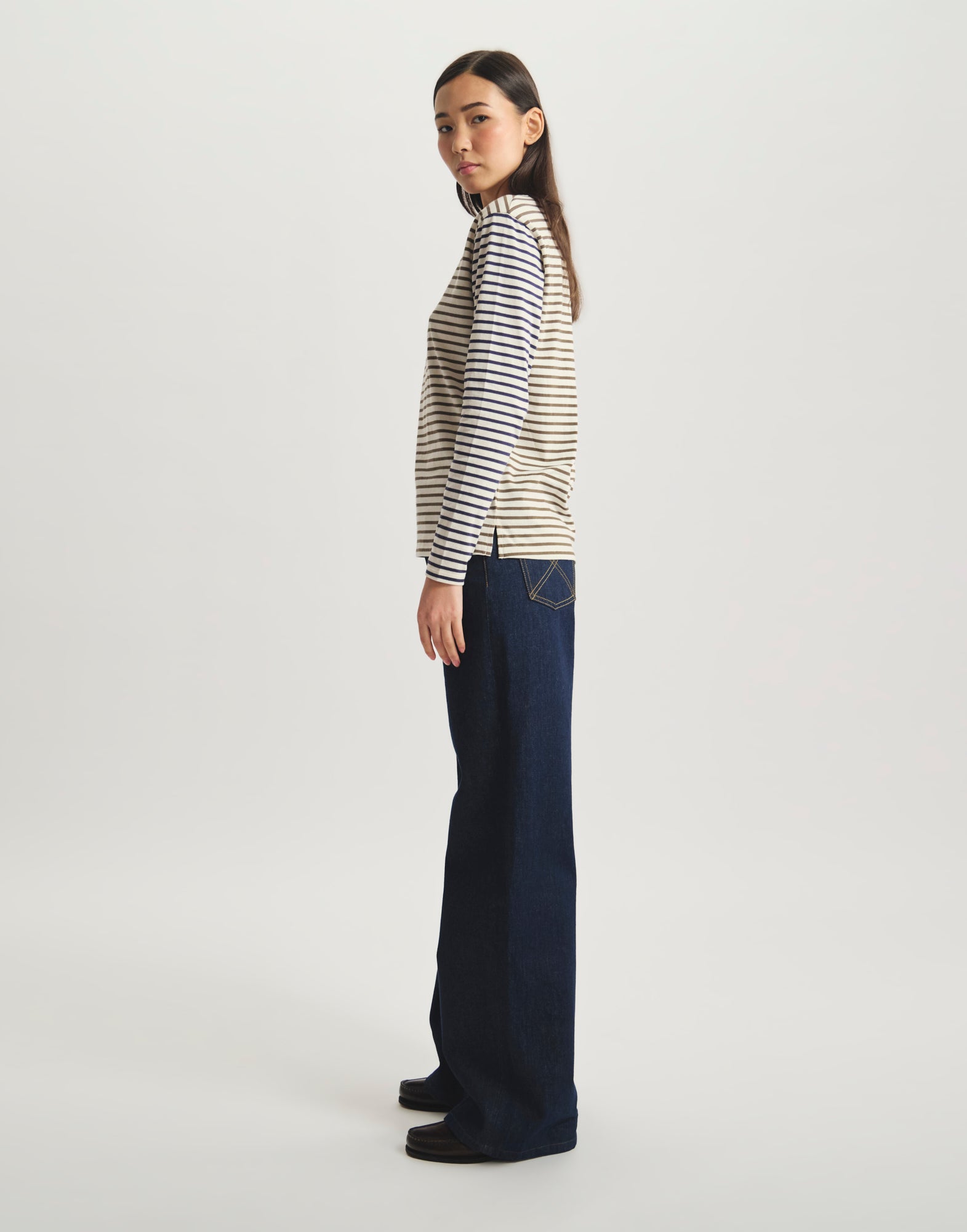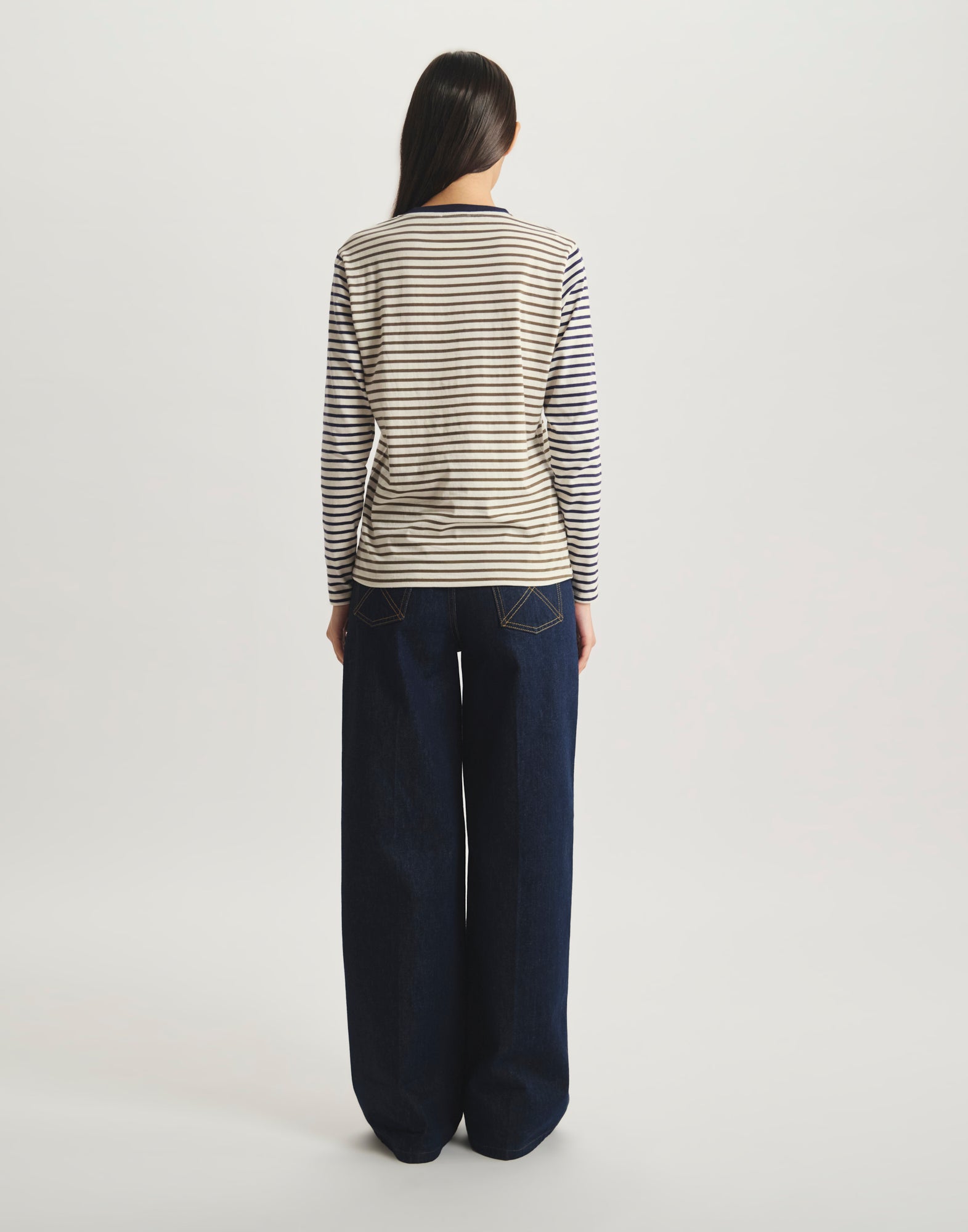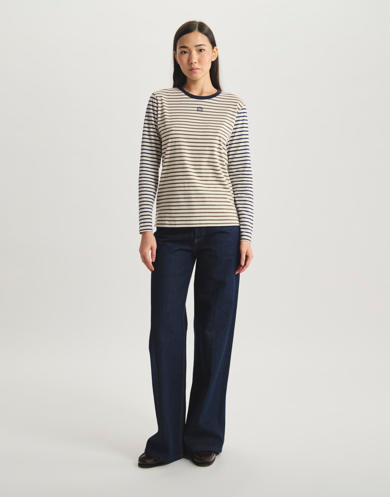 Le charme du classique revisité. Le top Anastasia adopte une rayure intemporelle dans une coupe droite et fluide. Confectionné en 100% coton jersey, doux et respirant, il offre un confort idéal au quotidien quelle que soit la saison. Col rond, manches longues, et détail signature : une feuille de chêne brodée au centre en dessous du col. Un essentiel à l’allure naturelle.