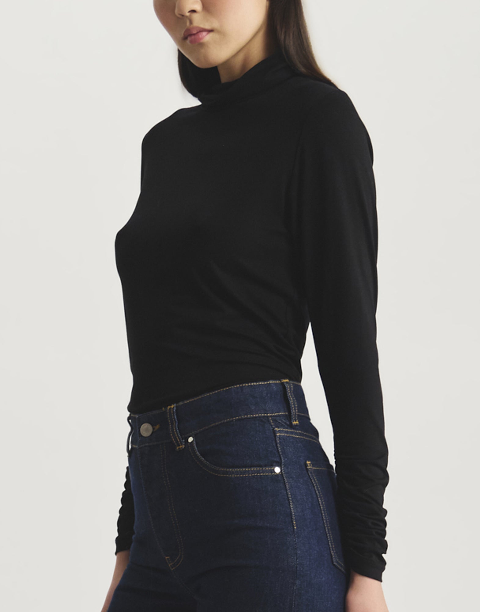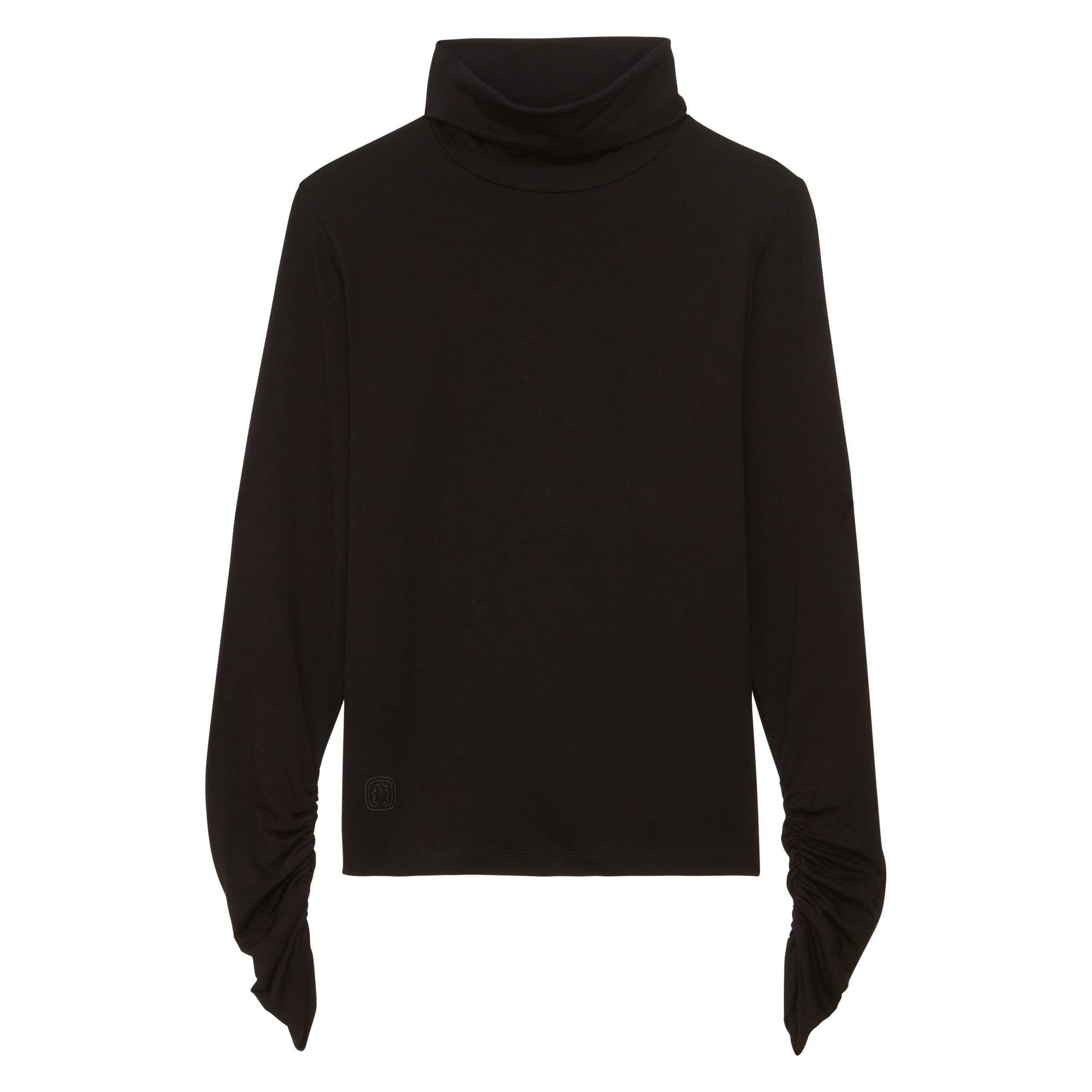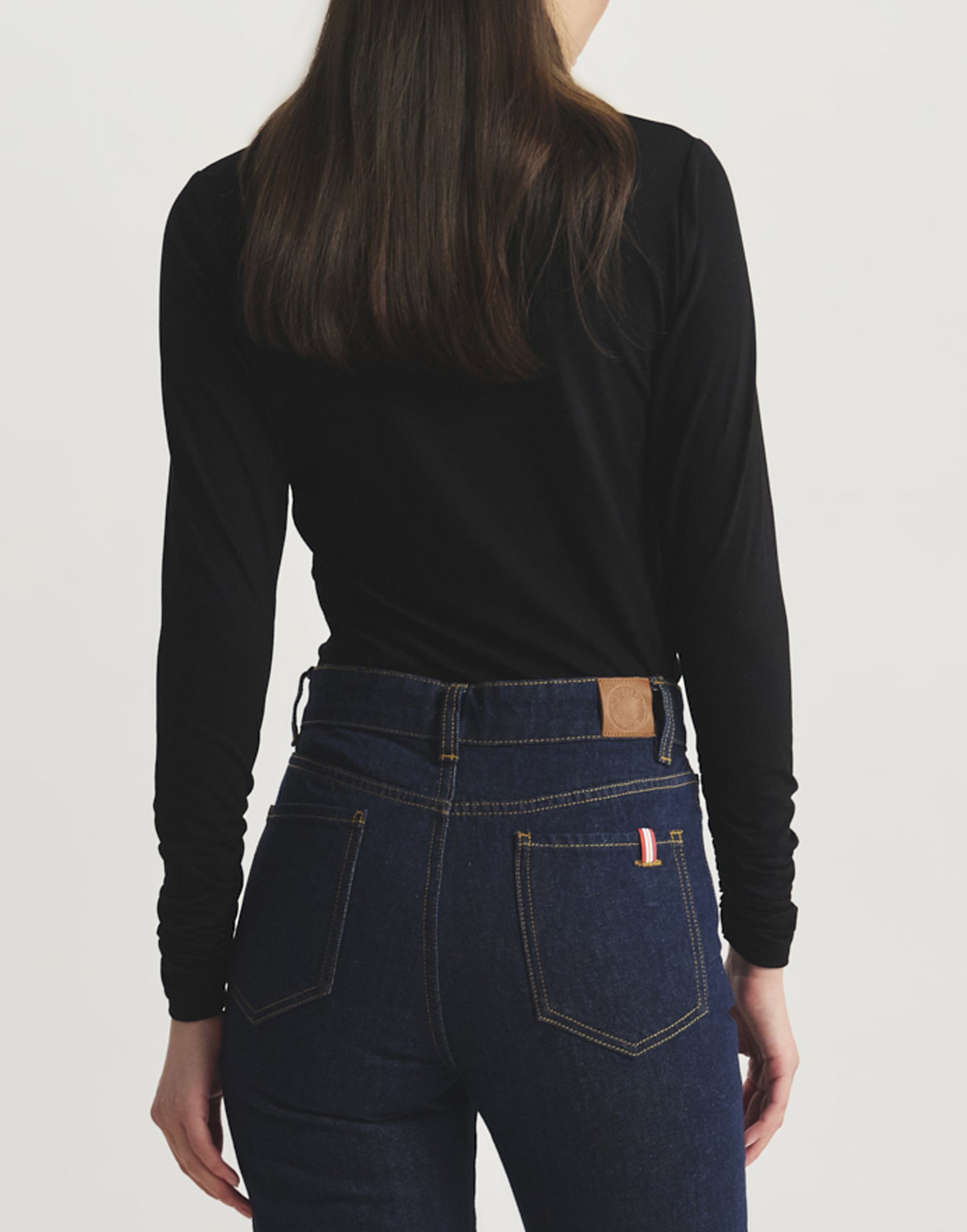 Le top Mireille, en noir profond, allie élégance et modernité grâce à sa coupe ajustée qui épouse parfaitement les formes. Confectionné en tissu écologique à base de viscose Ecovero, il offre douceur et légèreté. Son col roulé souligne délicatement le cou, tandis que les fronces au bas des manches apportent une touche de féminité subtile. Un détail brodé d’une feuille de chêne vient habiller le haut du devant, ajoutant une note raffinée et naturelle à ce classique revisité.