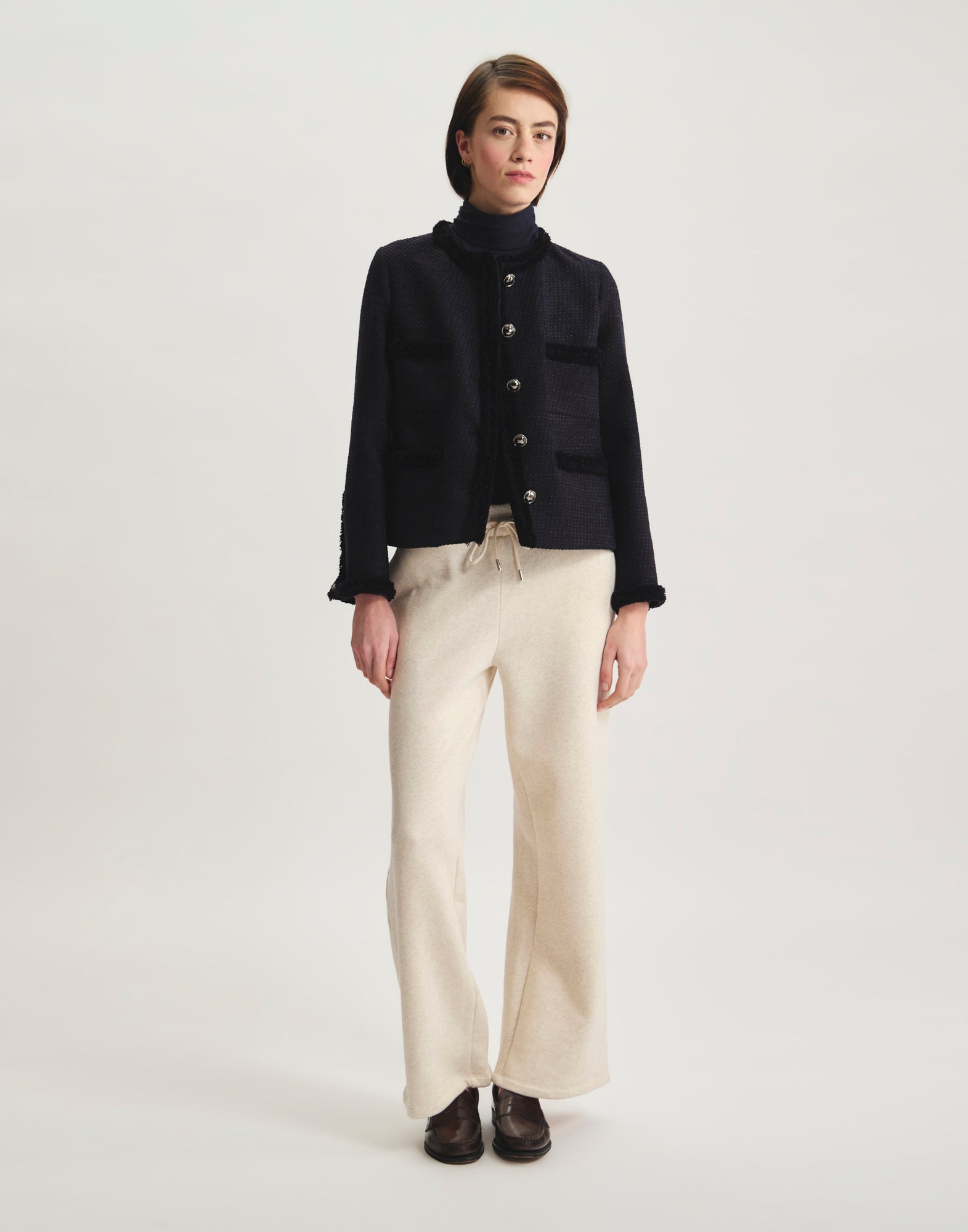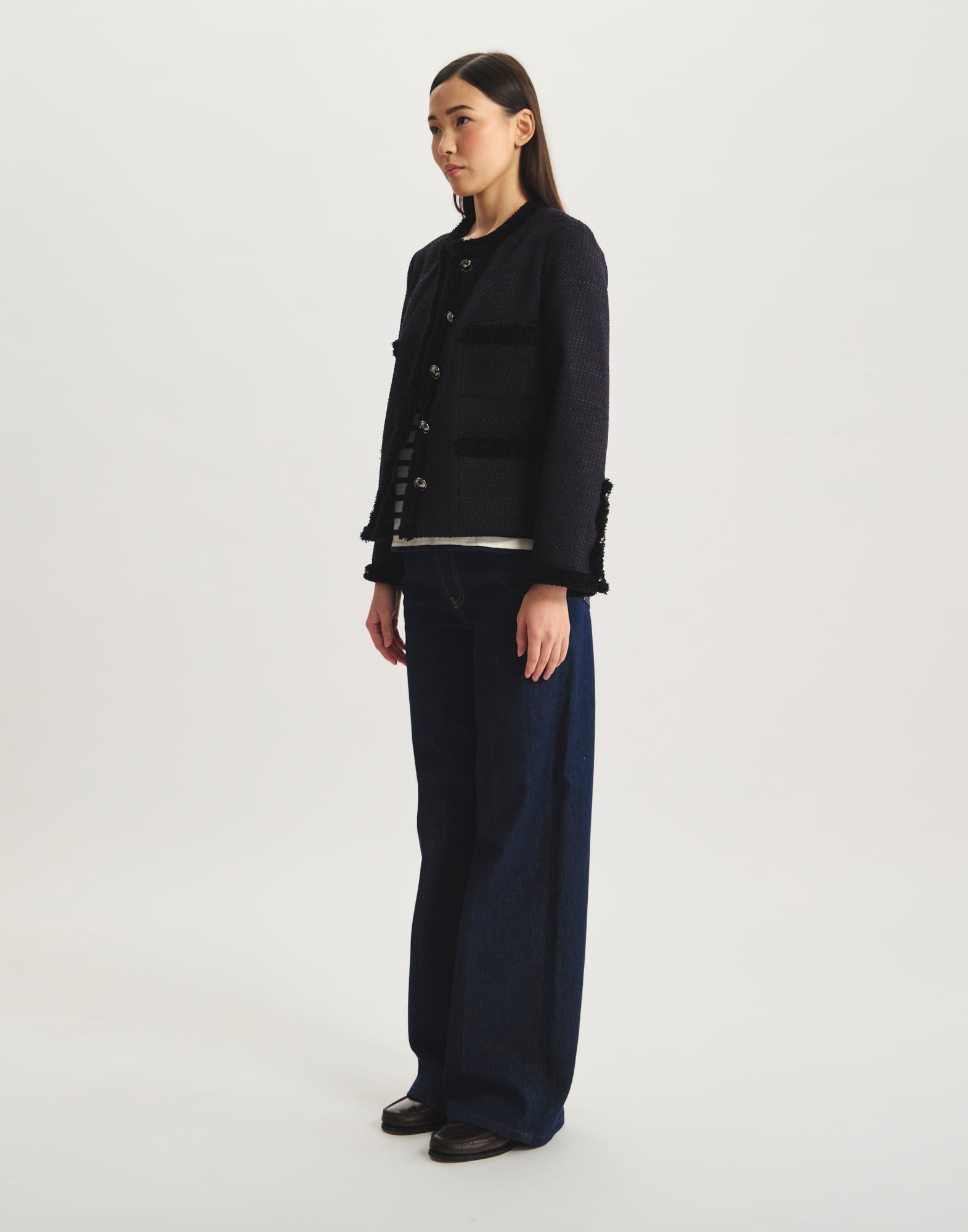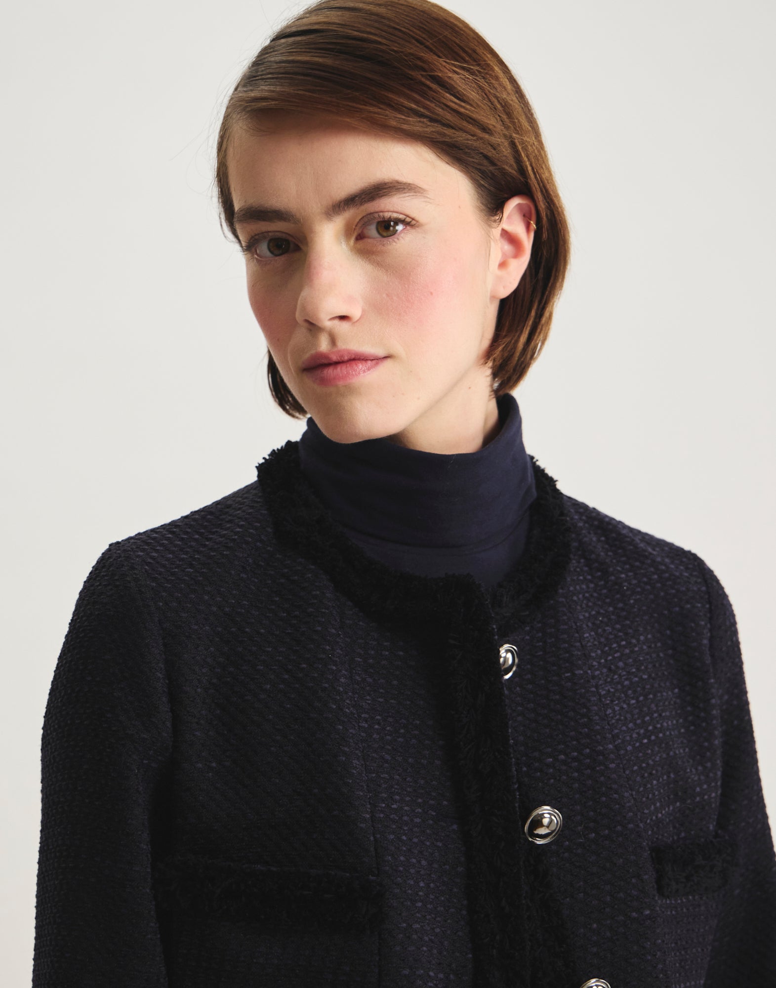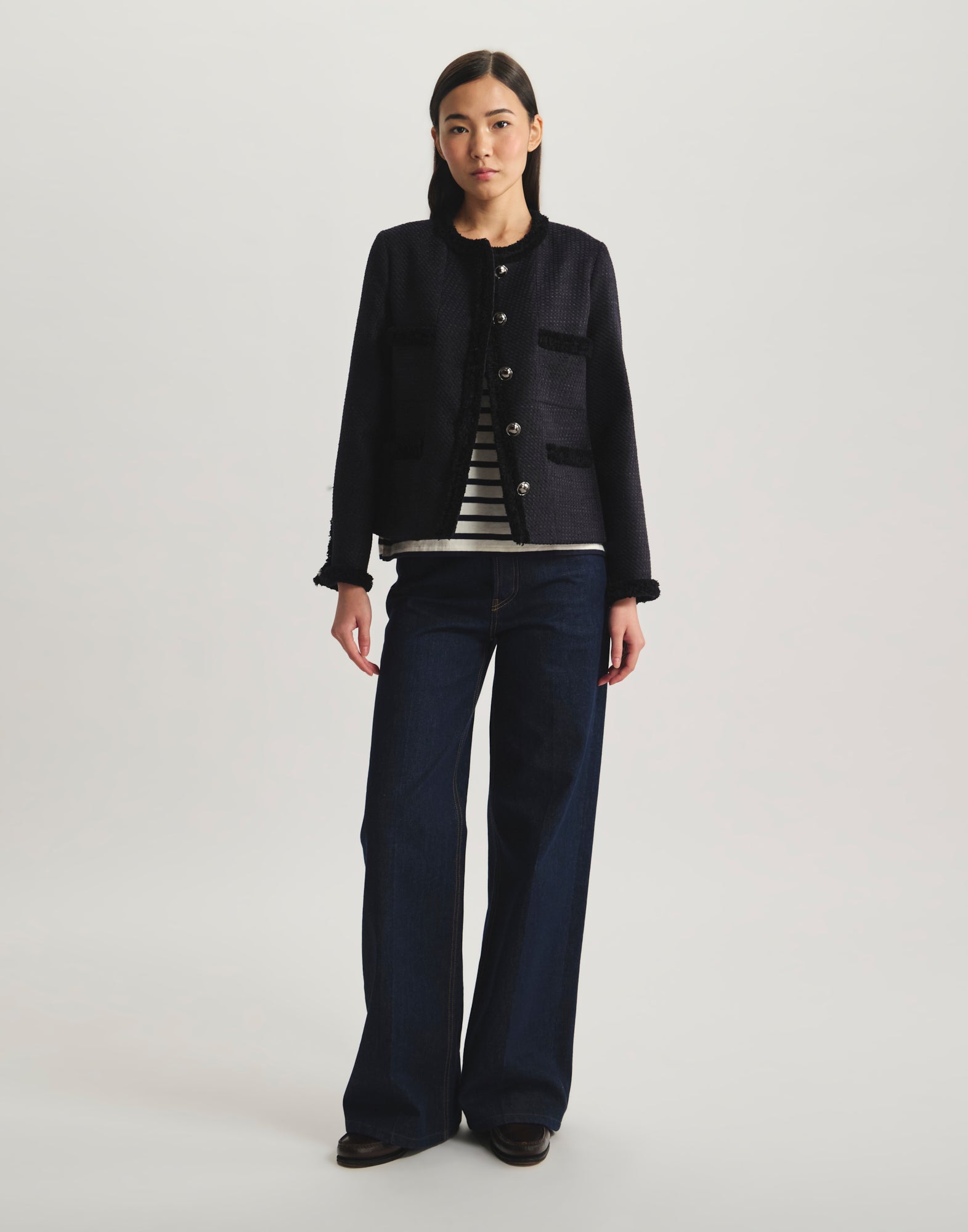 Icône du vestiaire parisien, la veste Adelaïde Bleu Navy séduit par ses galons tissés délicatement apposés sur les bordures, ses poches plaquées et sa coupe structurée. Confectionnée dans un tissu de qualité à la texture subtile, elle conjugue confort et raffinement pour sublimer vos tenues, du bureau aux balades urbaines. Une pièce mi-saison qui signe une allure moderne et intemporelle, parfaite pour affronter la fraîcheur citadine avec style.
